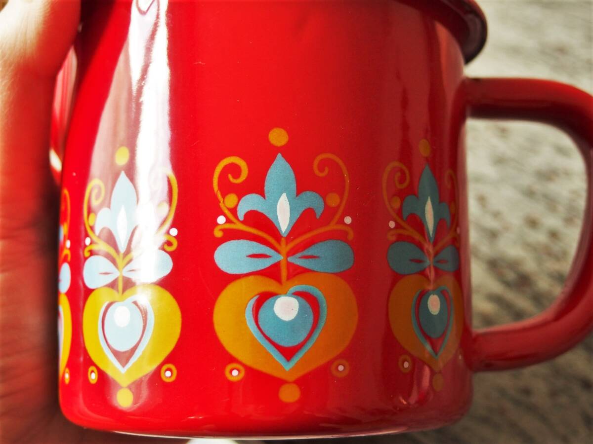 高品質!スイス ドイツ オーストリア ヴィンテージ ホーロー (エナメル) 琺瑯 クリーマー、ピッチャー (赤地にフォークロア模様)
