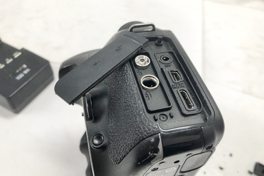 外観擦れ・傷・強い使用感がございます。ファインダー内にチリホコリの混入がございます。正面ロゴ塗りつぶし・テープ跡がございます。マイクやHDMIの端子カバーが破損して欠品しております。ございます。バッテリーが欠品しております。カード書き込み・AF/MF撮影・内蔵ストロボ発光動作確認済みでございます。