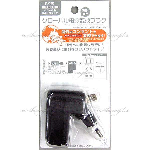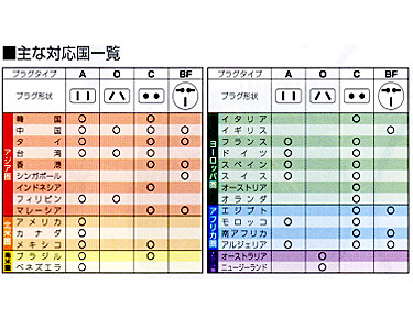 コンセントの形状は各国それぞれですが、このプラグは、Aタイプ、Oタイプ、Cタイプ、BFタイプ、アース式のいずれのタイプにも対応していますので、1個あれば、どこの国に行っても安心です。