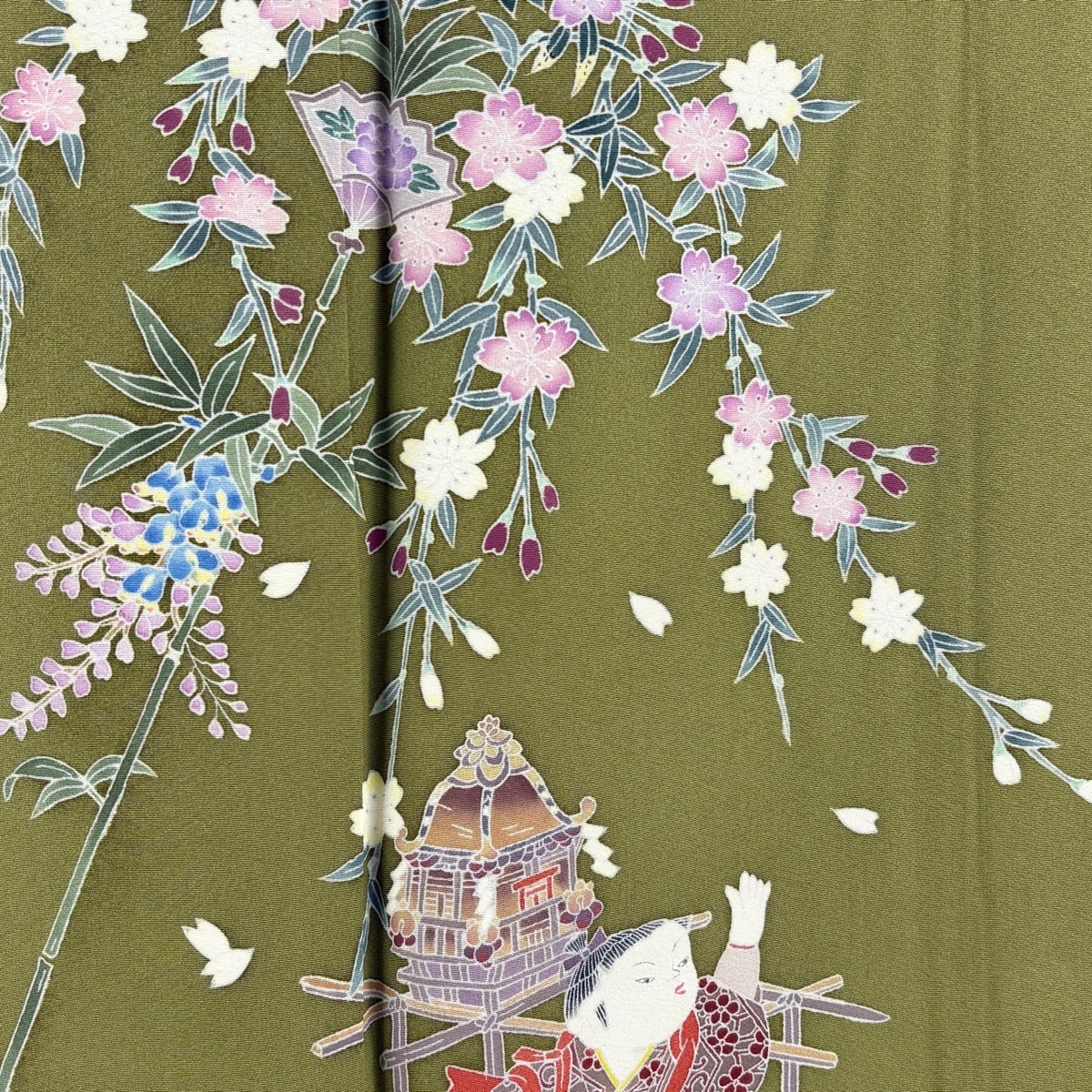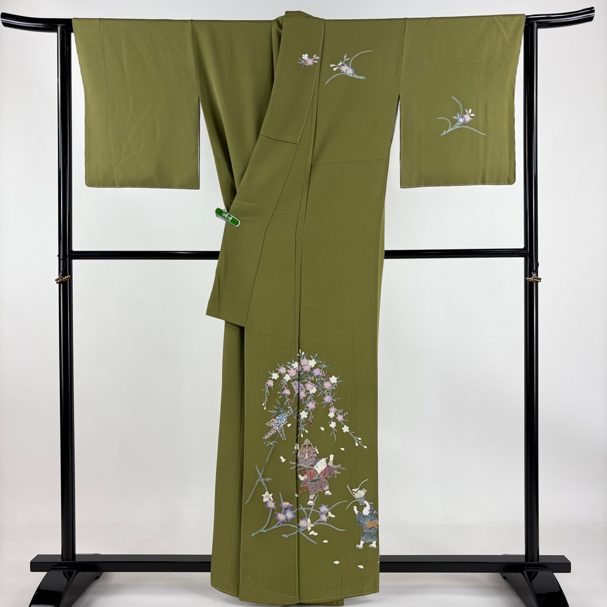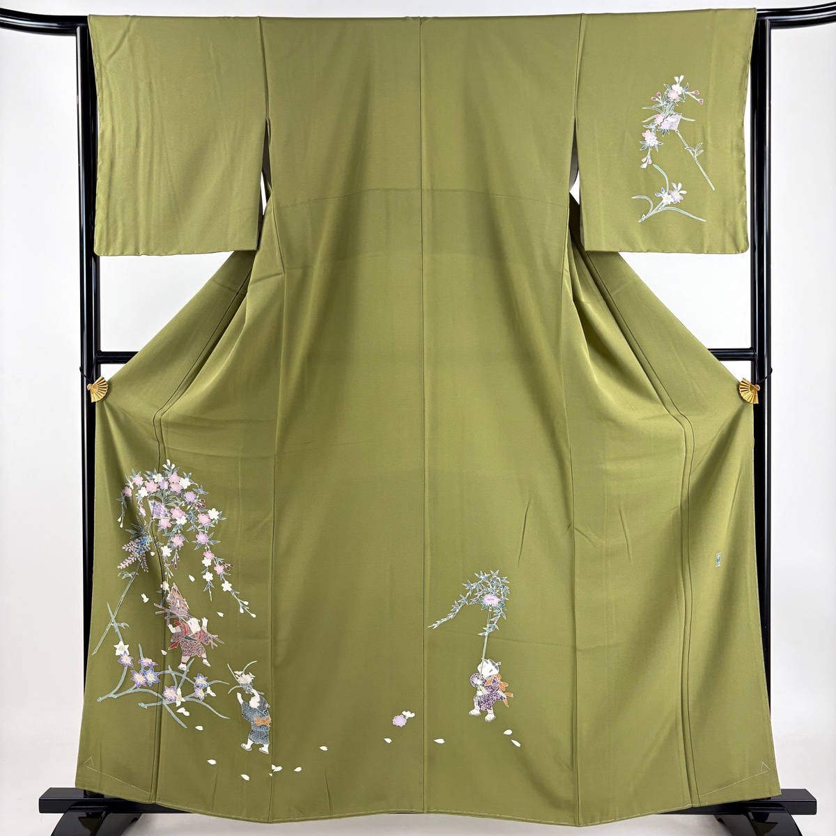 | 付下げ 美品 逸品 岡本幸治 落款 やまと 童 神輿 鶯色 袷 身丈160.5 裄丈64 M 正絹 【中古】 |