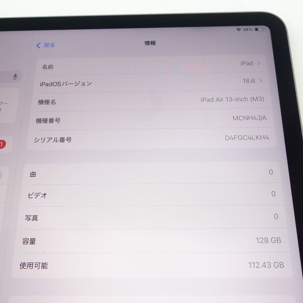 098 Apple iPad Air 13インチ Wi-Fi 128GB スペースグレイ MCNH4J/A バッテリー最大容量100% ※中古 □付属品:電源アダプタ、充電ケーブル、印刷物、外箱 ※画像にあるもので全てです。 □型番:MCNH4J/A □バージョン:18.6 □シリアル:※※※4LKH4 □保証状況 限定保証 有効期限:2026年4月30日 □カラー:スペースグレイ □動作確認内容 ・初期化済み ・起動から初期化までの簡易的な動作確認済み □状態 ・バッテリーの最大容量は100%です。 ・背面に若干のヨゴレ、液晶には写真では判別しにくい程度の小キズが見受けられますが、 その他に大きく目立つダメージは見受けられません。 ・外箱には保管に伴うスレ、キズ、ヨゴレ、若干の角ヘコミ等の傷みがあります。 □水没反応:なし □備考:なし ※SIMロック解除の状況・有無については当方では分かりません。 ※商品到着後にもし上記説明にない内容(動作不良、ロックなど)がございましたら必ず1週間以内にお知らせください。 その際はご返品・ご返金にて対応をさせていただきます。 ※商品の性質上、各種機能・ネットワークについてなどの詳細な確認はできておりません。 ※保証のない中古品であることをご理解いただける方のみご購入ください。 ※如何なる場合においても修理、代替え品への交換、用意には対応できません。 ※ご返金は商品を確認させていただいてからの対応となりますのでご了承ください。 ※この携帯端末を不正利用する為にご購入をお考えの方は、ご購入をお控えください。 ※ご購入後、端末の不正利用が発覚し情報の提供を要求された場合は、躊躇なく第3者への情報提供を提示いたします。 ※画像では判別しづらいUSED品特有の薄い汚れや薄いキズ、細かいキズなどある場合があります。 |