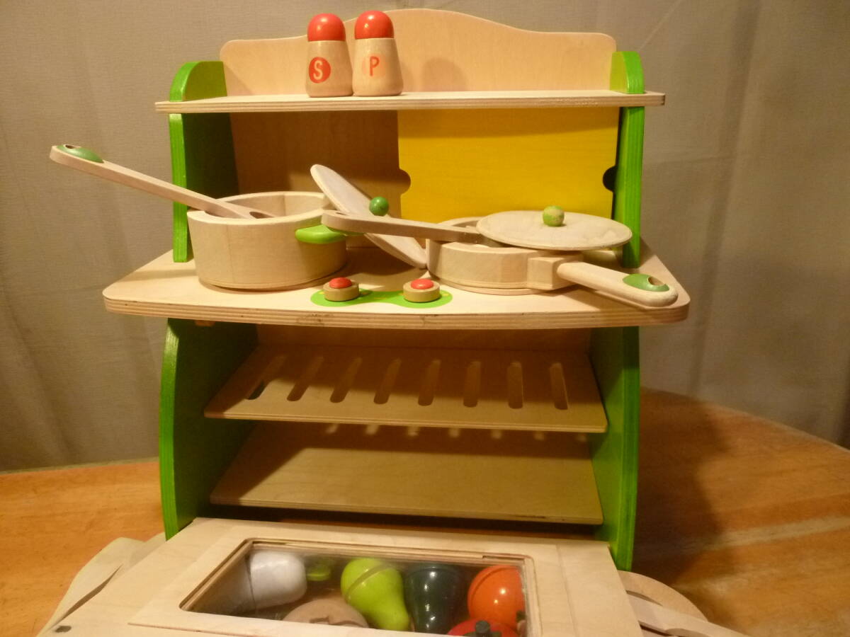 こちらは木製の小型キッチンと器具や食材等のセットになりますが、メーカー色々でセット内容は当方の判断でとなります。キッチンのコンロは2個でダイヤルはクルクル回り、その奥は扉が一方のみの収納庫となっていて、その上は調味料置き等です。テーブル下は間仕切り付きの収納庫となっている様で、調理器具はフタ付きの鍋とフライパンやフライ返し等・まな板と包丁・塩、コショウ・お皿やホークとナイフ等で、食材はザクッと出来る野菜や果物とパンや梅ぼし入り(色のみ)のおにぎり等沢山セットにしてあります。