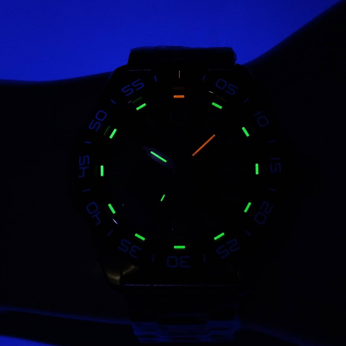 25年以上自己発光する「ルミノックス・ライト・テクノロジー」は、一般的な蓄光とは異なり、外光やバックライトを必要とせず、暗闇でも正確に時間を把握できます。その視認性と頑丈さから、アメリカの特殊部隊NAVY SEALSやSWAT、戦闘機パイロットに正式採用されています。