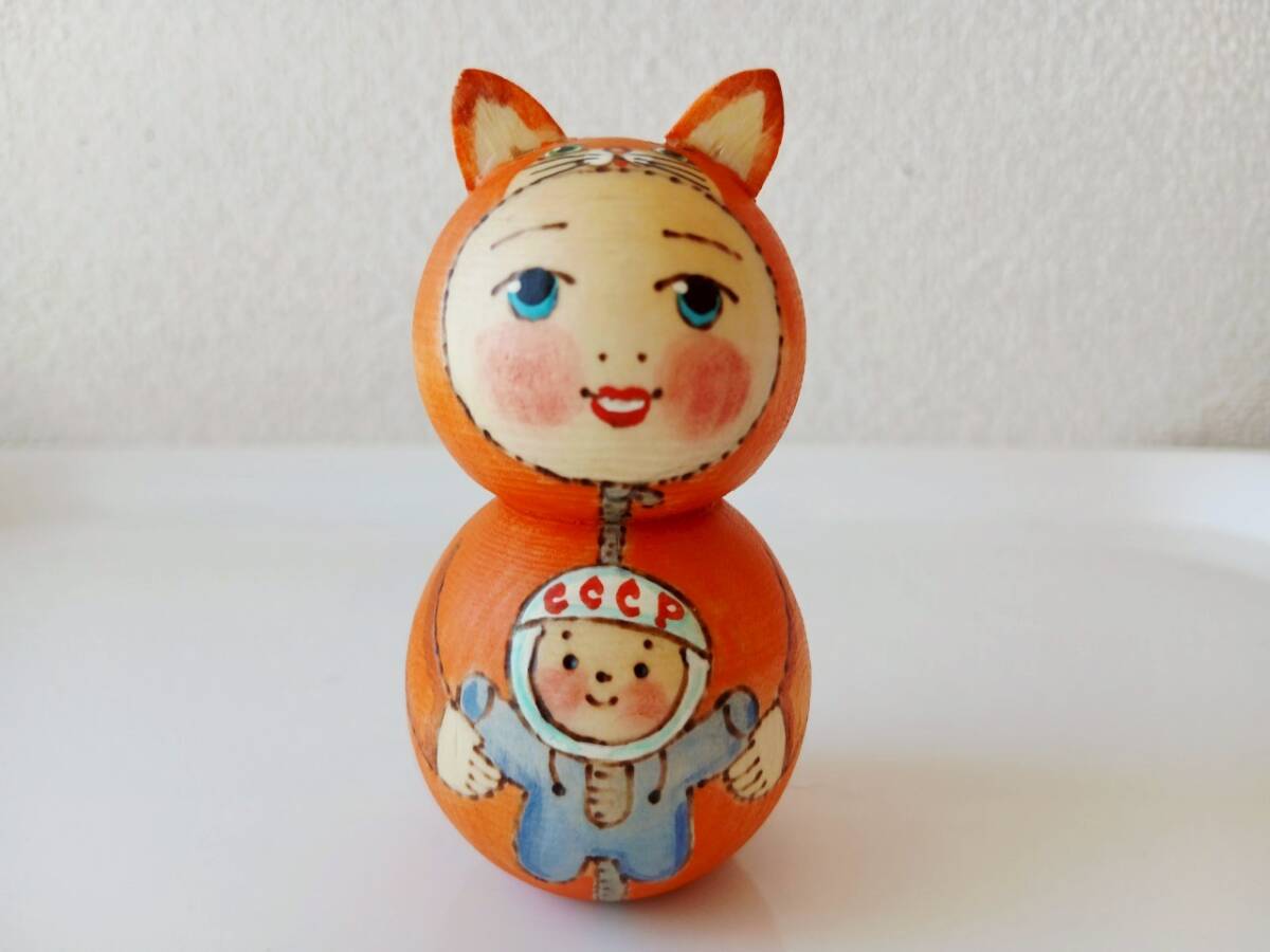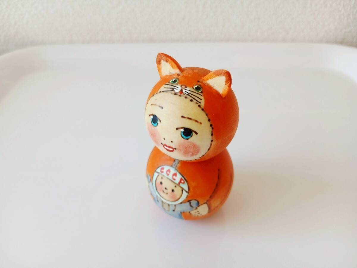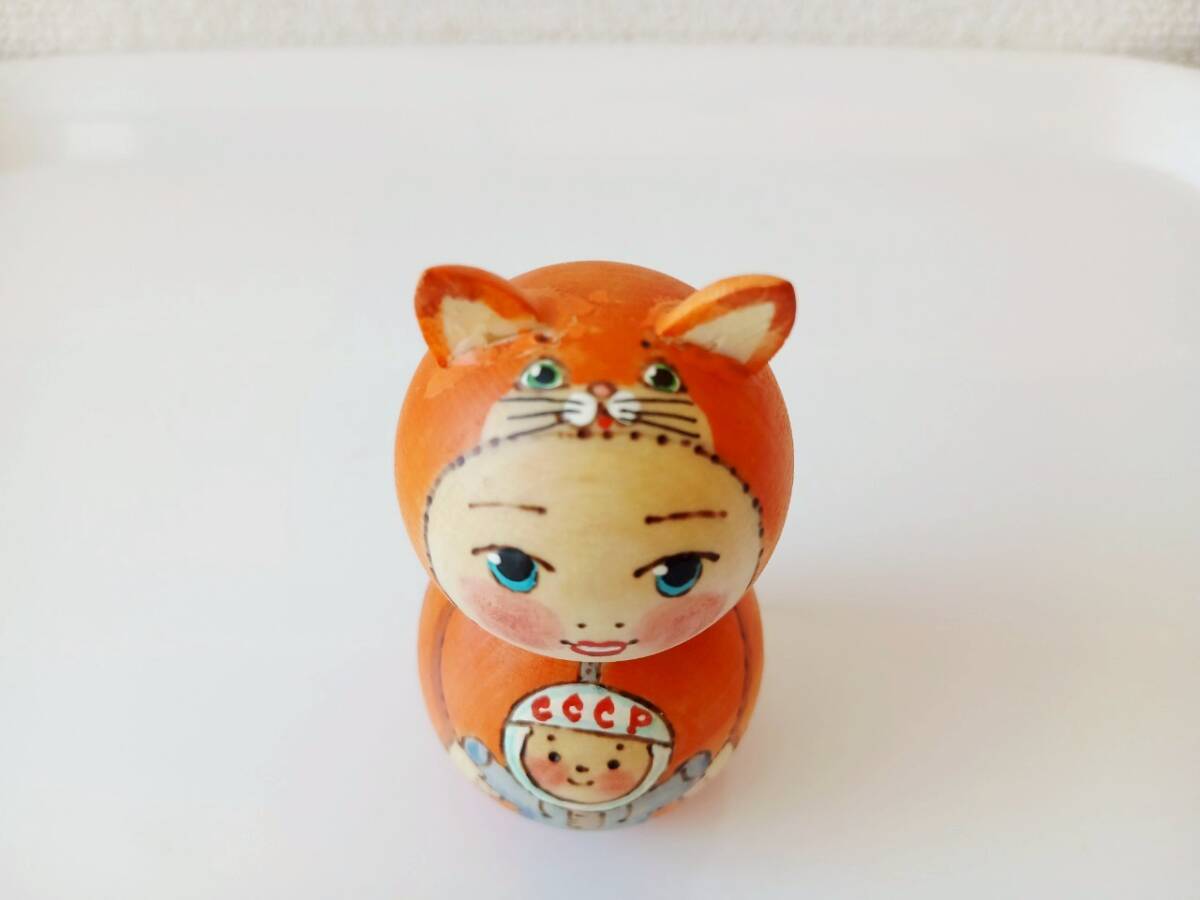 【LYH276-B】北欧ロシア雑貨 リューバ作 木製人形 CCCP 宇宙開発 ねこ