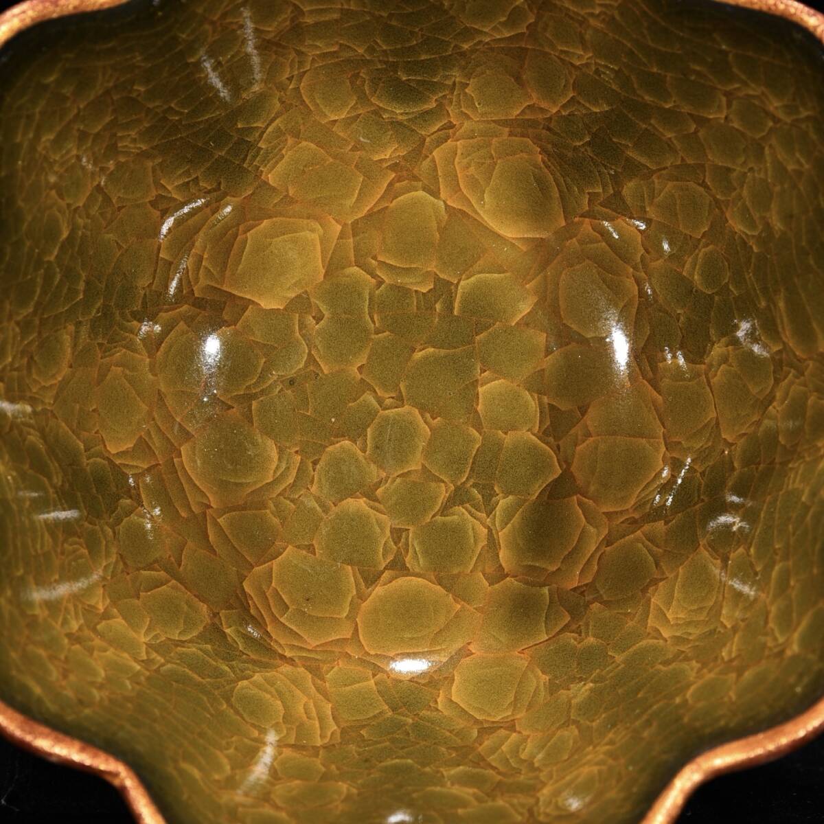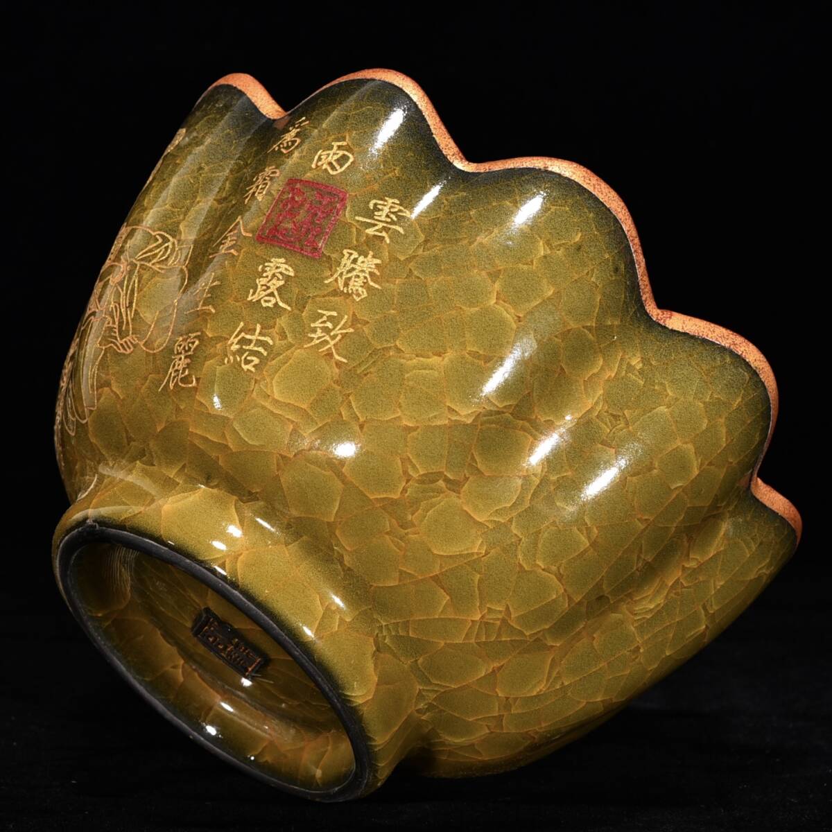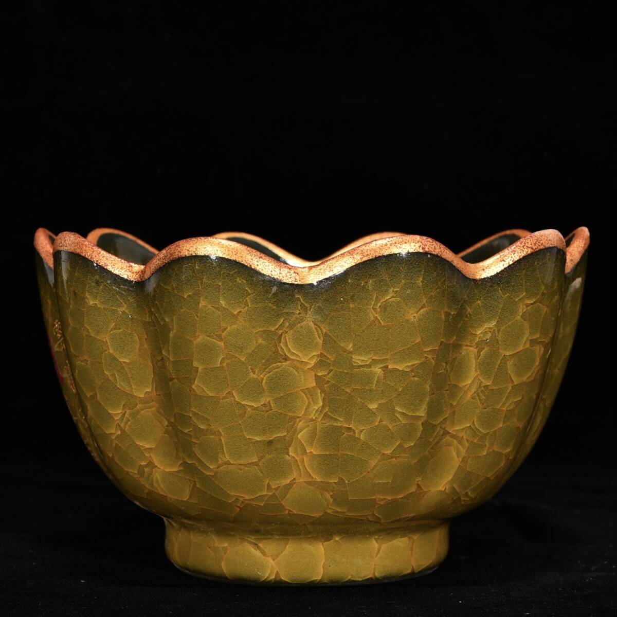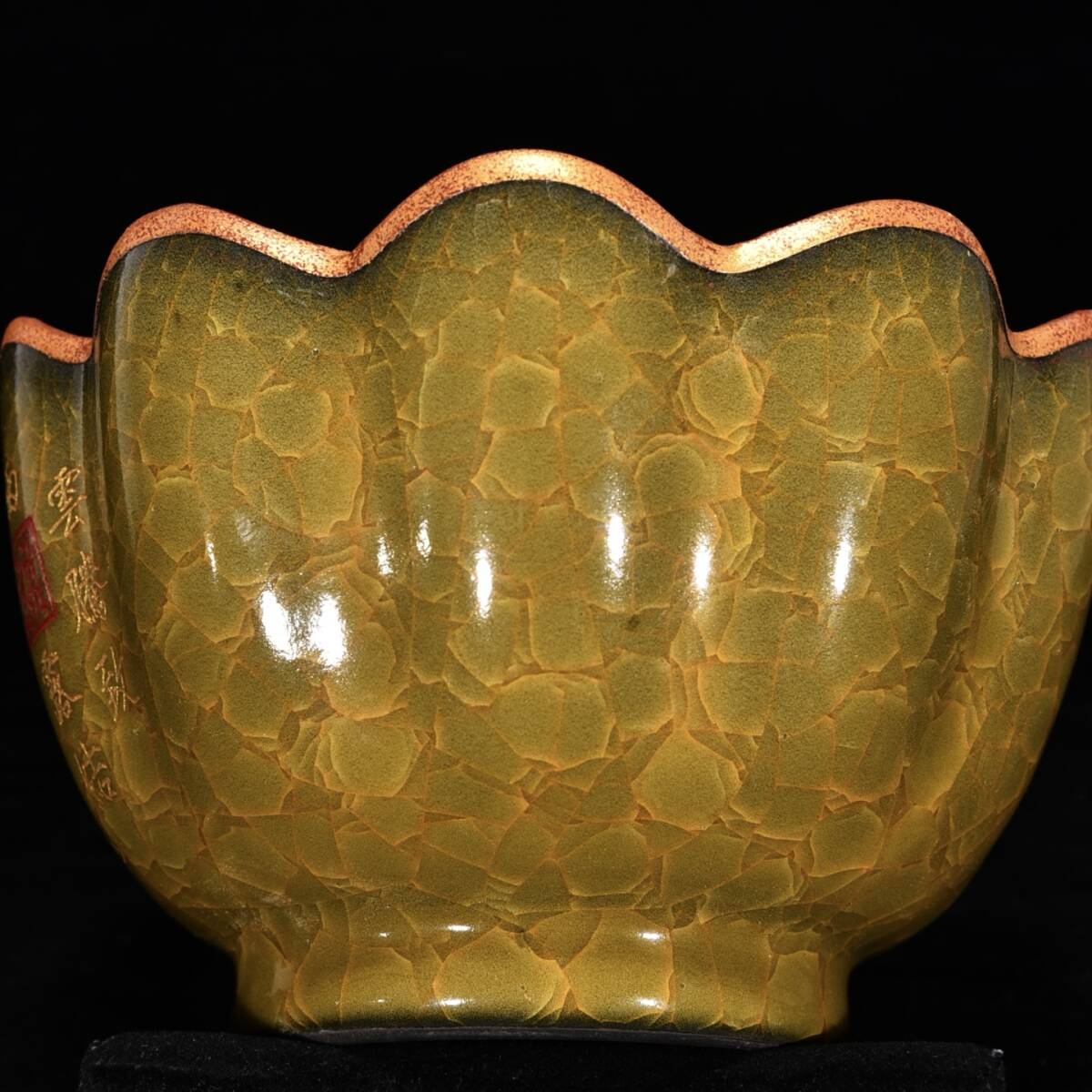 FL8092:8 人間国宝 中国骨董 磁器【宋官窯黄釉氷割れ包口銘文金刻鳳紋蓮華碗】工芸品 施釉陶 青花磁 陶芸 本物 古美術 旧蔵 珍品