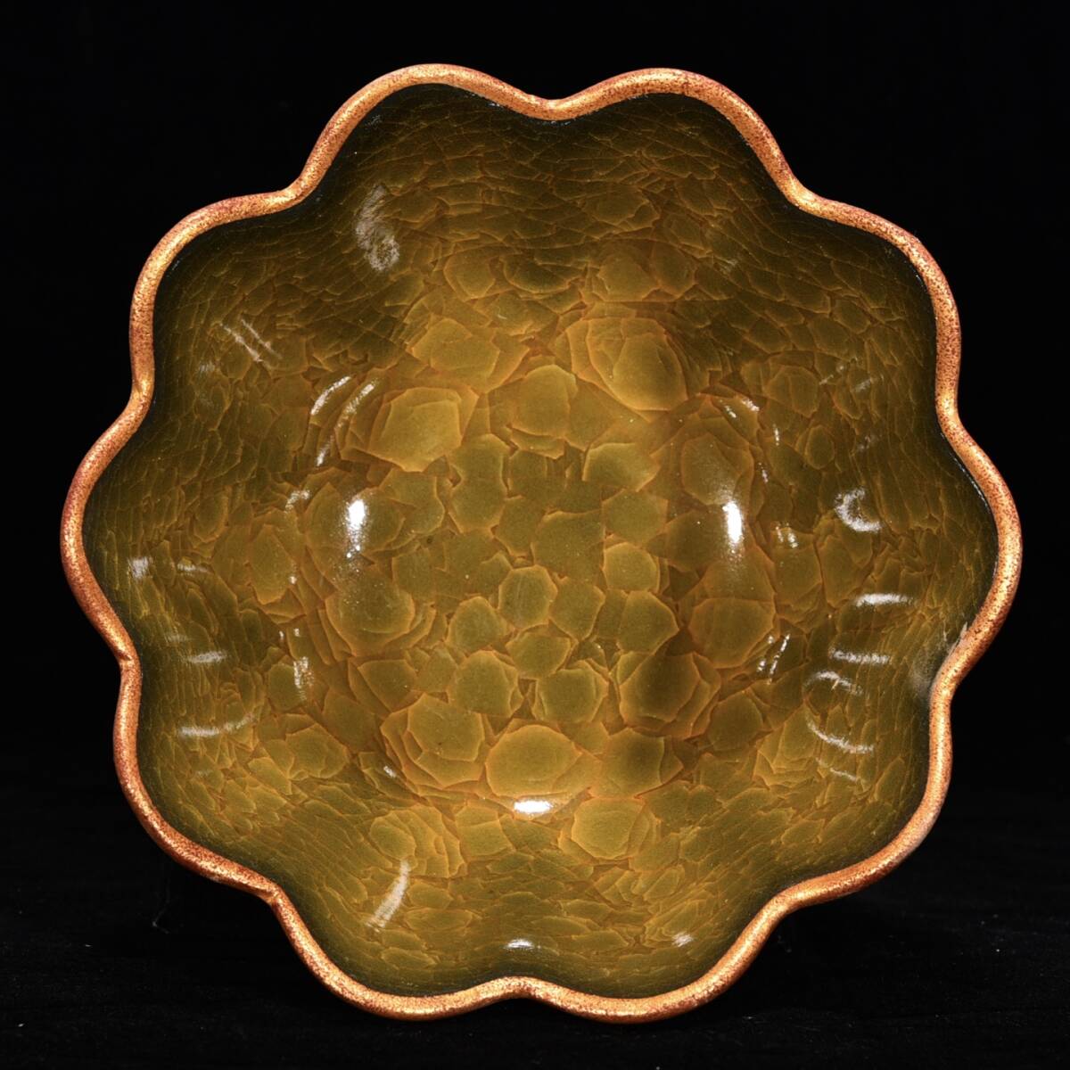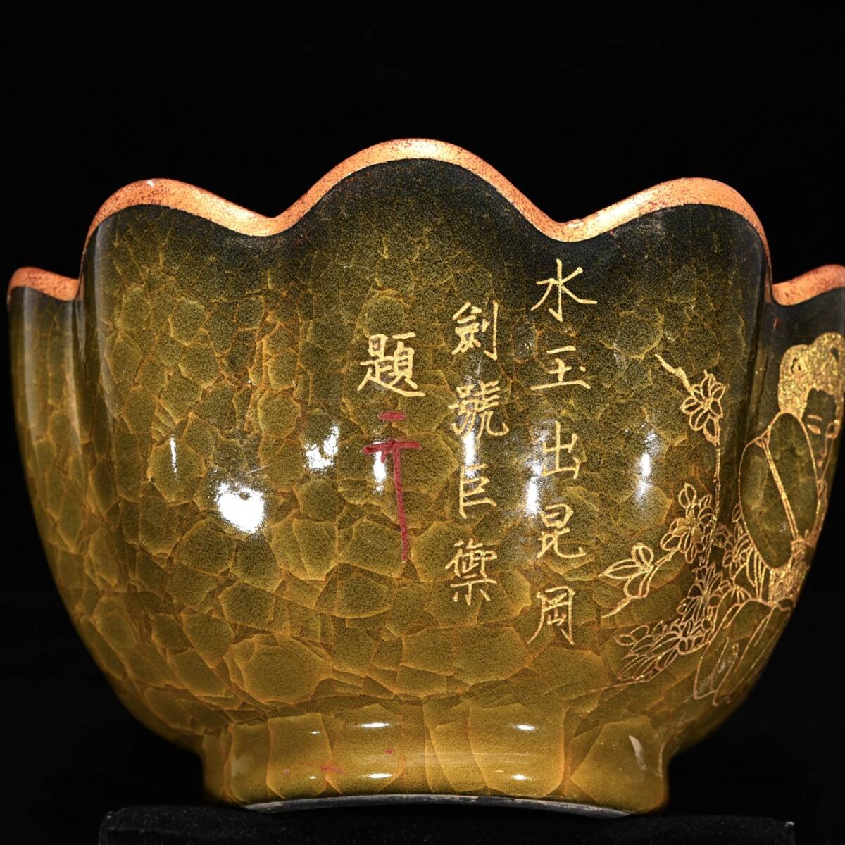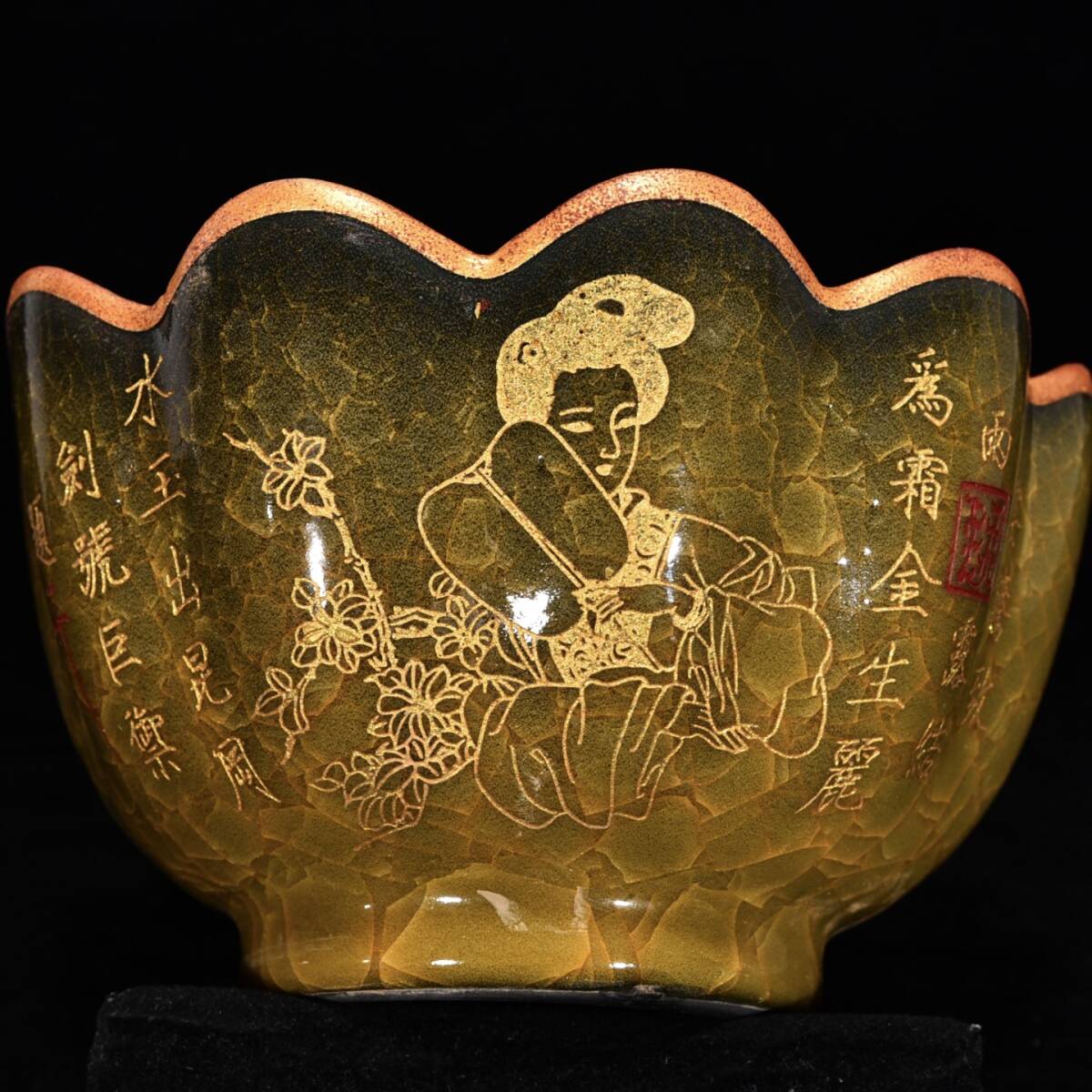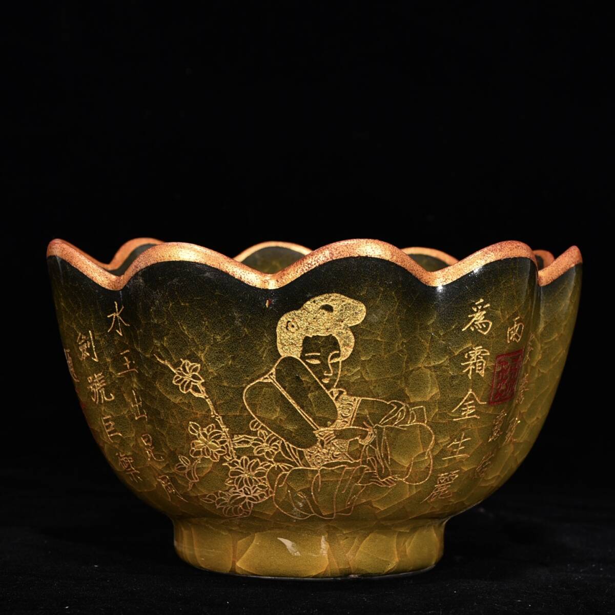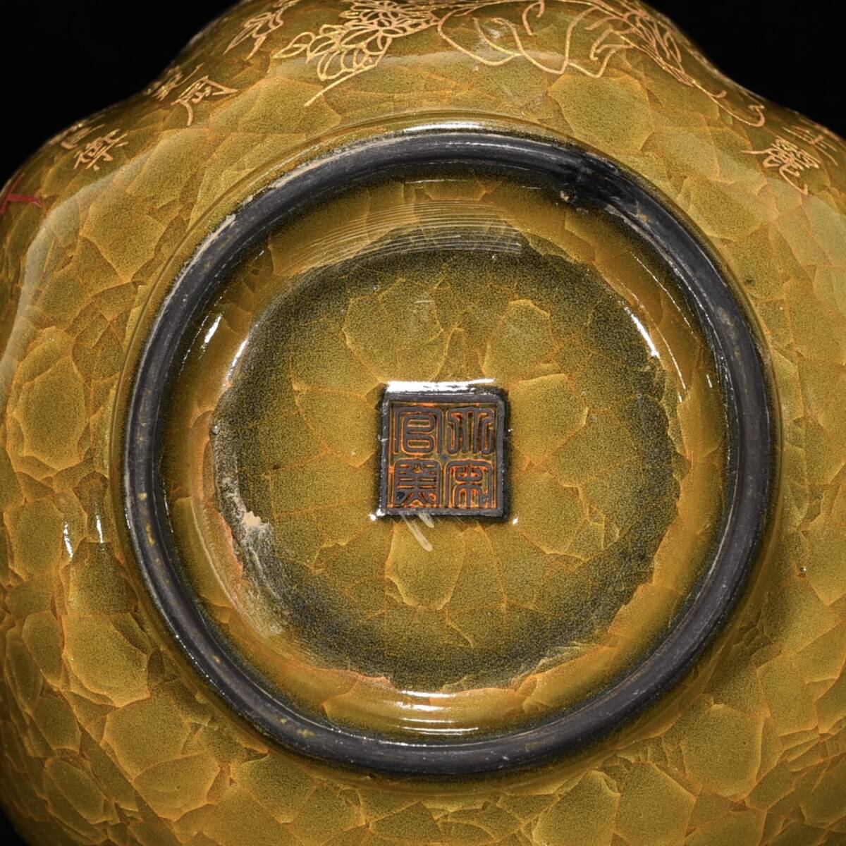 FL8092:8 人間国宝 中国骨董 磁器【宋官窯黄釉氷割れ包口銘文金刻鳳紋蓮華碗】工芸品 施釉陶 青花磁 陶芸 本物 古美術 旧蔵 珍品