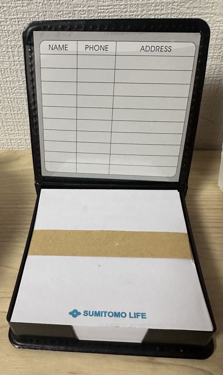 住友生命、ノベルティ、非売品、記念品、メモ帳、ノート、メモパッド、デスク用品、レザー調、革、ブラック、黒、シンプル、卓上、文房具、オフィス用品、グッズ