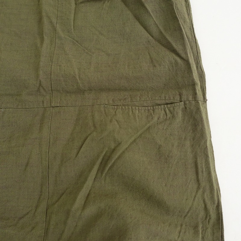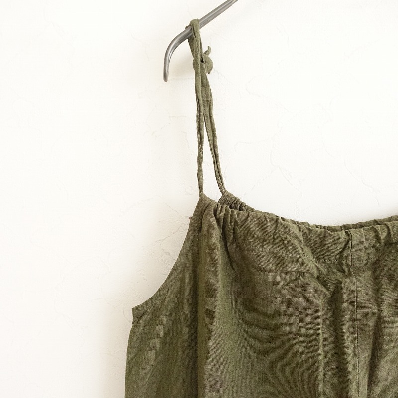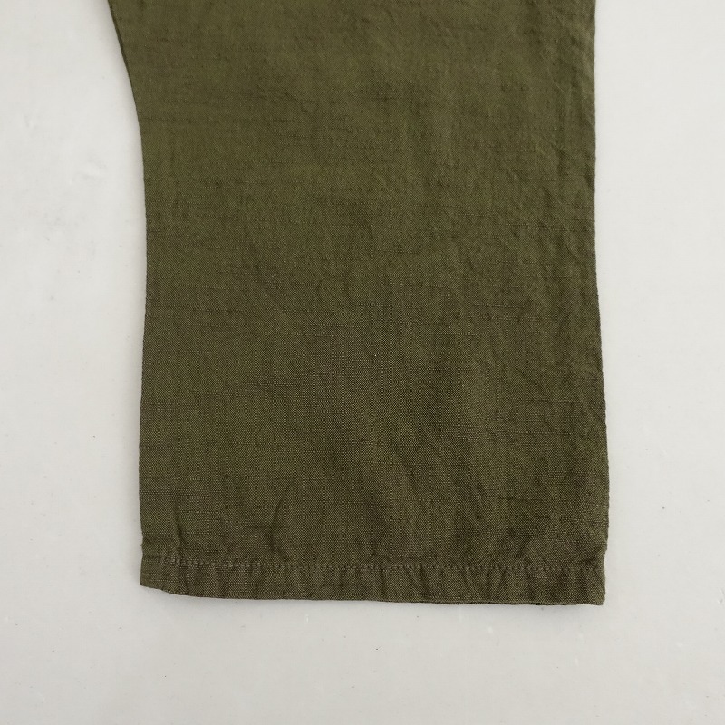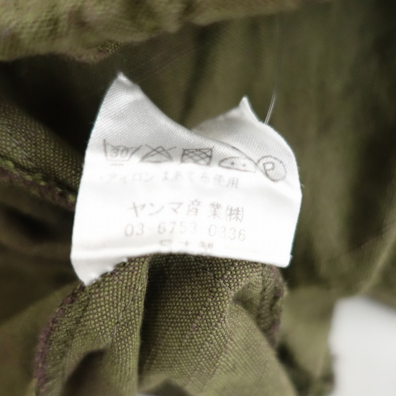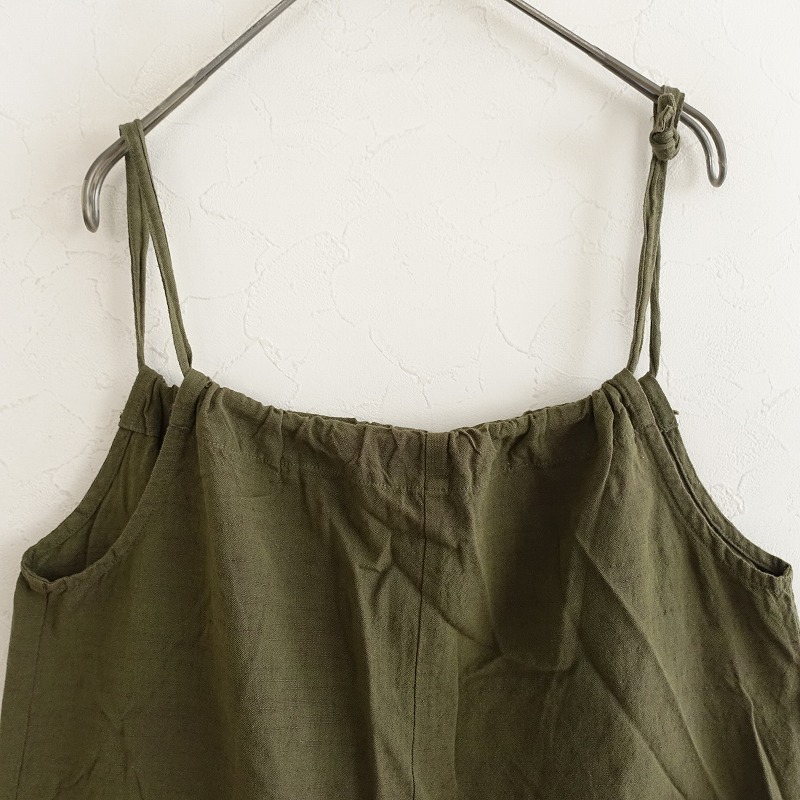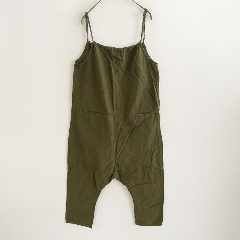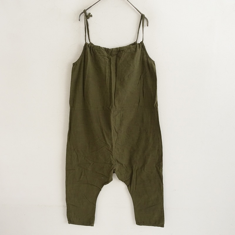 YAMMAのコットンサロペットパンツです。カラーはグリーン系カーキで、会津木綿のようなスラブのあるコットン地で仕立てられております。肩紐は結び目にて長さ調整可能になっており、フロント両サイドにポケット付き、サルエル風のシルエットになっております。 |