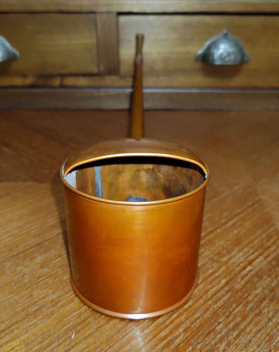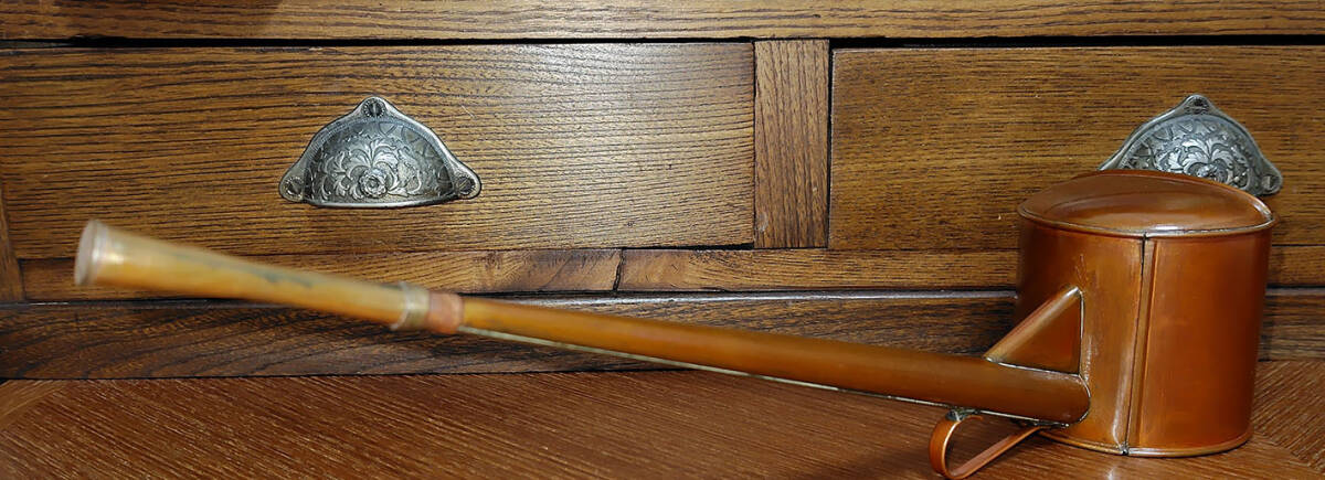 日本橋三越に園芸部があったころに購入した善啓の銅製如雨露。製作されてから50年くらい経ている物だと思います。表面を硫化処理していてその錆色は現在流通している銅板そのままのきらびやかな銅製如雨露とは違いはじめから渋く味わいがあります。またそのためもあるのか接合部のはんだ付け(元々ばり取りが丁寧)の跡はまったく目立ちません。