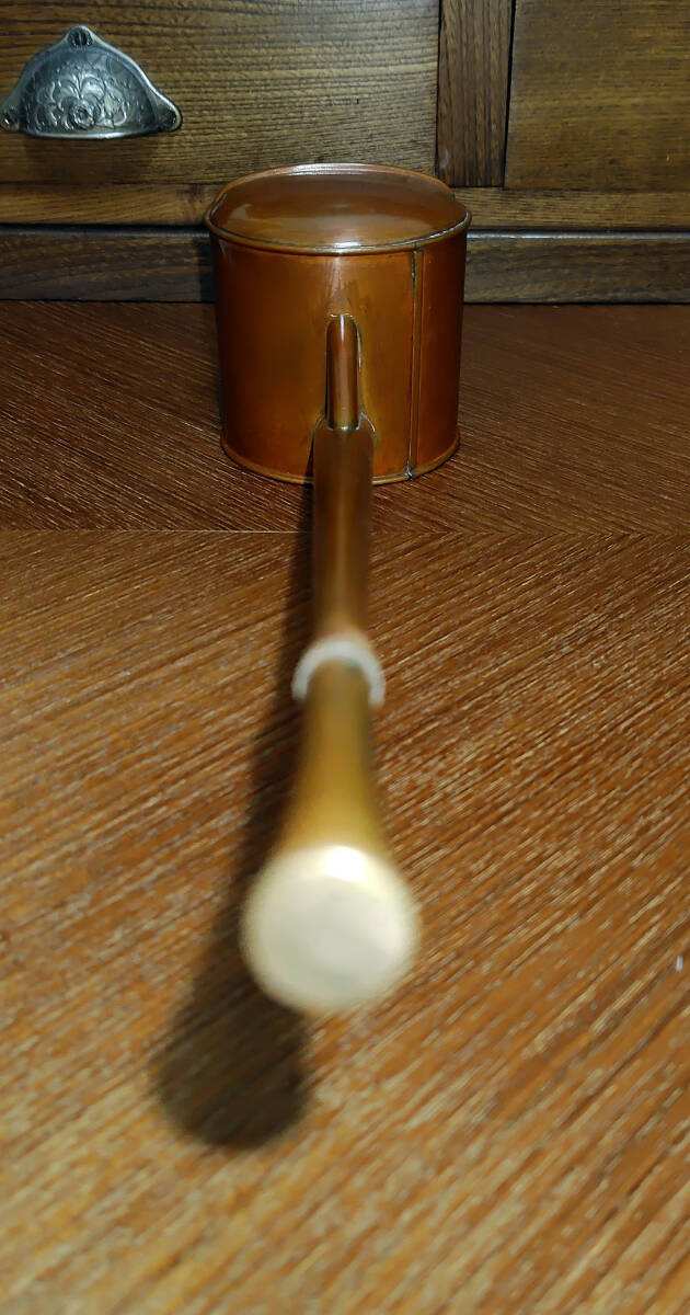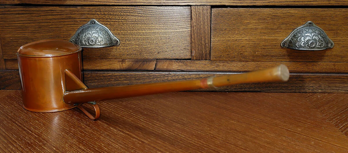 植物の水やり用といった本来の用途とは別に、戦前の小鳥飼育書などには盆栽如雨露を小鳥飼育の水切り用に使ったといった紹介があり、過去にはこれに倣って機能美を兼ね備えた善啓の如雨露を特に道具のフォルムに拘りのある東京・千葉方面の飼鳥家が転用し使っていたようです。中でもこの豆サイズと一つ上の小サイズが小鳥の水切りにタンクの容量、ハス口から出るやわらかい散水の量ともに適切だったのでしょう。特にこの豆サイズのハス口の穴は小サイズに比べ8穴と少なく、植物の水やり用には向いていないようです。植物用として使用したい場合は新たにハス口を作製した方が良いと思います。未使用品ですが経年品でありますこと、その点ご承知おきくださいますようお願い申し上げます。底に善啓の刻印。ハス口は直口1ヶ付。正確に測っていませんが容量は250ccくらいだと思います。(ハス口を付けた状態(全長):36cm、タンク直径:7.9cm、ハス口直径:1.1cm)