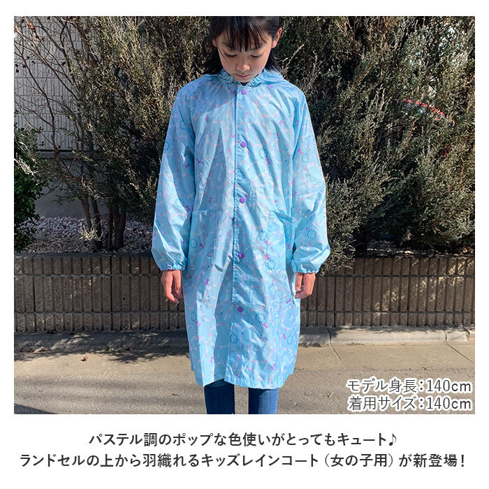 商品説明 | ・・パステル調のポップな色使いがとってもキュート♪ランドセルの上から羽織れるキッズレインコート(女の子用)が新登場! ・軽い着心地のコート生地にははっ水加工を施したポリエステル100%素材を採用し、雨のしずくからお子さまの身体をしっかりガード!(※完全防水仕様ではありません。) ・フードのひさし部分に広めの透明窓をデザインし、前方・左右まで視野が妨げられない安心設計。 ・コート背中には、スナップボタンを外して広がる「ランドセルタック」付き。ランドセルやリュックを背負ったままでもすっぽりと着用可能。 ・自動車のライトにピカッと光る☆背中のタック部分にはハートやアニマルモチーフのリフレクター素材が付いているので、薄暗い雨の日でも安心♪ ・前合わせは、お子さまご自身でパチンッと簡単に留められるスナップボタンタイプ。 ・袖口部分はゴム入りギャザー仕様で手首にしっかりフィット!風の強い日も雨の侵入をしっかり防止。 ・袖の下、両脇部分に蒸し暑い時期でも快適な通気口を配置。さらに、厚着をする季節でも肩や腕がもたつかないラグラン袖のデザインにすることで、オールシーズン軽い着心地をキープ。 ・前開き裏側部分にはお名前を記入できるネームタグ付き。お友達とお揃いでもコートを取り違える心配のない嬉しい仕様。 ・プリンセスや貝殻のモチーフをパステルタッチで描きだした、オシャレなガールズにオススメのゆめかわデザイン。持ち運びに便利な収納袋付き。 |