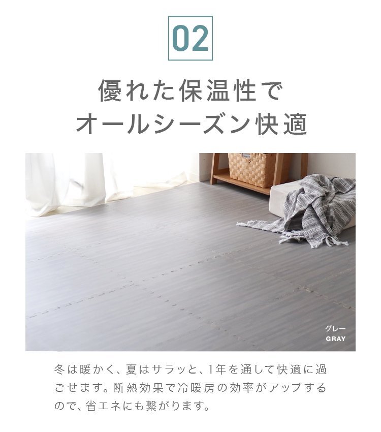 | パパもママも安心! 60cm 大判 ジョイントマットです。 大判サイズだから、敷く枚数も少なく、設置もラクラク! カッターやはさみで簡単に切れるのでレイアウト自由自在! 足音をやわらげてくれるので、子供部屋やフローリングのお部屋に最適です! 適度なクッション性が転倒時に衝撃を和らげてくれます! 冬は床下からの冷気をカット! 夏は冷房による温度を効率よく保ちます。 汚れた部分は取り外して水洗いが出来てカンタンお手入れ♪ 嬉しい!サイドパーツ付き! 壁ぎわに敷いても、隙間なくキレイに。 掃除がラクラク!! 自然をイメージした木目デザイン! お部屋に落ち着いた雰囲気を与えてくれます! |