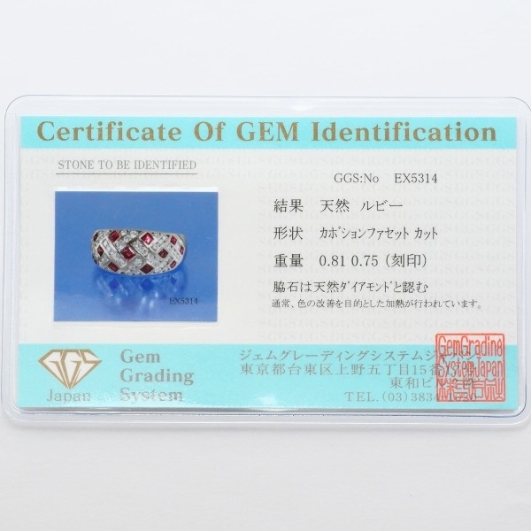 【素材】 PT900/プラチナ 【石目】 天然ルビー 0.81ct 天然ダイアモンド 0.75ct 【総重量】 約10.4g 【サイズ】 約12.5号 【最大幅】 約10mm 【サイズ直し】 不可 【付属品】 カード式鑑別書(ジェムグレーディングシステムジャパン) 【商品の状態】 新品仕上げ済み 【コメント】 格子状に煌めくダイヤモンドと情熱的なルビーが織りなす、芸術的な逸品。気品と存在感を併せ持ち、指先に洗練された華やぎを添えるリングです。緻密な細工が生む陰影が、見る角度によって表情を変え、永遠に飽きのこない魅力を放ちます。 | |