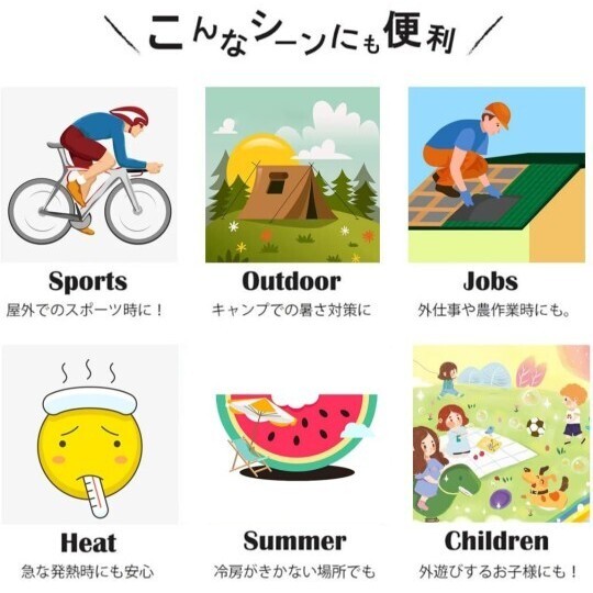 幅広い用途:ゴルフ、釣り、バスケットボール、サイクリング、ハイキング、運転、ガーデニング、勉強中や仕事中、スポーツ観戦や野外活動、作業現場でもあらゆるシーンで活躍できます。:やさしい冷え方でお子様や女性へのプレゼントにも喜ばれています!使用可能時間は30度~35℃の間で約180分持続します。
