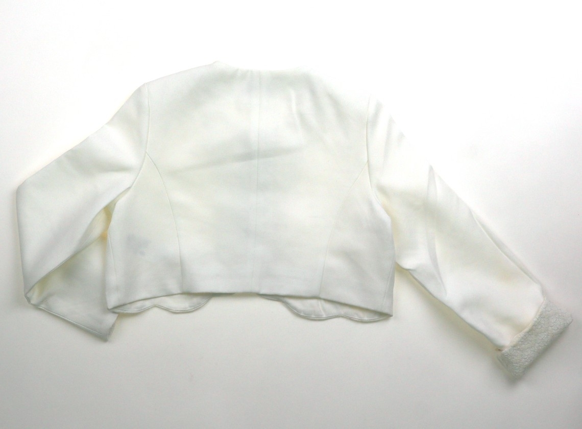 ポリエステルツイル布帛生地で裏地付き。ブランドネームのレース部分に1cmの黄ばみ汚れがあり。左袖山に薄く3cmほどの黄ばみシミがあります。左袖先に2cmほどの黄ばみ汚れあり。肩パットあり。前裾スカラップデザイン。前裾リボン飾りあり。袖口裏はレースです。袖口に若干黄ばみ感あり。型崩れはありません。