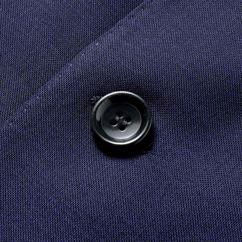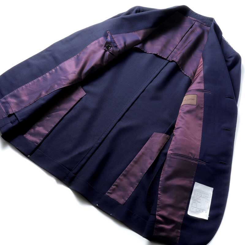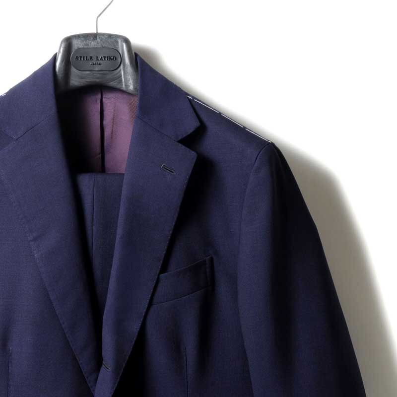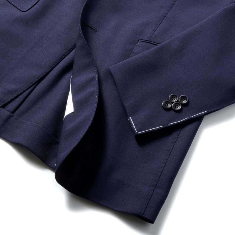 ・肩から首にかけての吸い付くようなフィット感の美しいのぼり、立体的でふんわりと仕上がったふくらみのあるラペル、ナチュラルな弧を描く前振り袖、ウエストが程よくシェイプされた美しいシルエット、上質な芯地を使用した柔らかなショルダーライン(マニカカミーチャ)など、伝統的なナポリ仕立てをベースにハンドを駆使してつくられています。