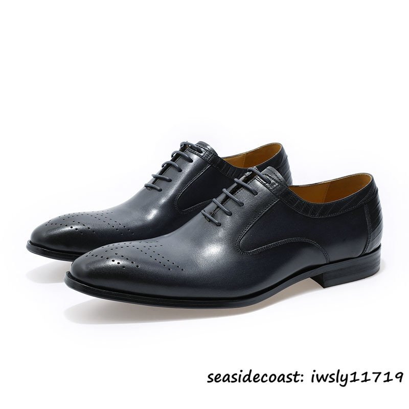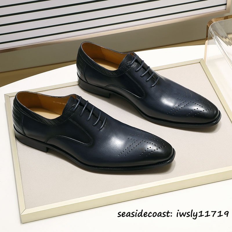 定価9万超■超希少 本革レザーシューズ メンズ ビジネスシューズ 職人手塗り上げ 彫り 最高級牛革 紳士靴 革靴 フォーマル ブルー 24.5cm