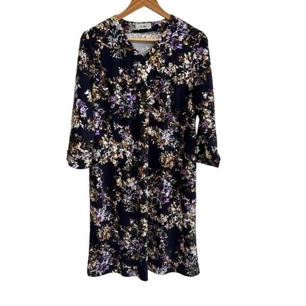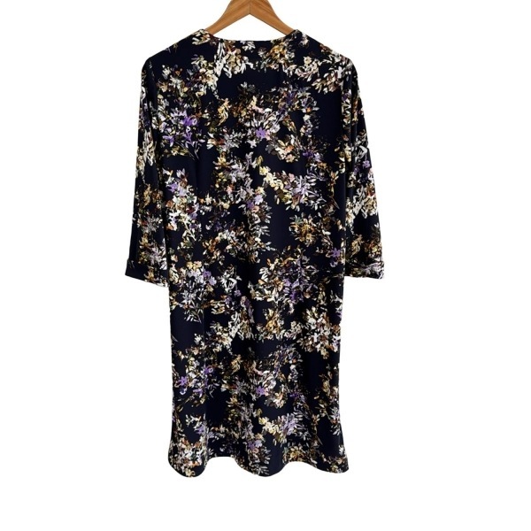 レリアン Leilian サイズ13+ S - ネイビー×パープル×マルチ レディース Vネック/長袖/ひざ丈/花柄 美品 ワンピース