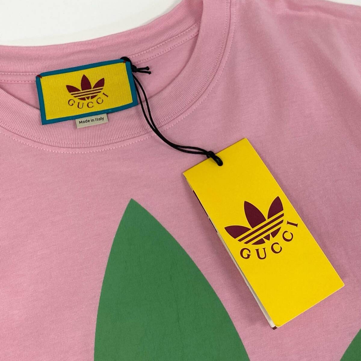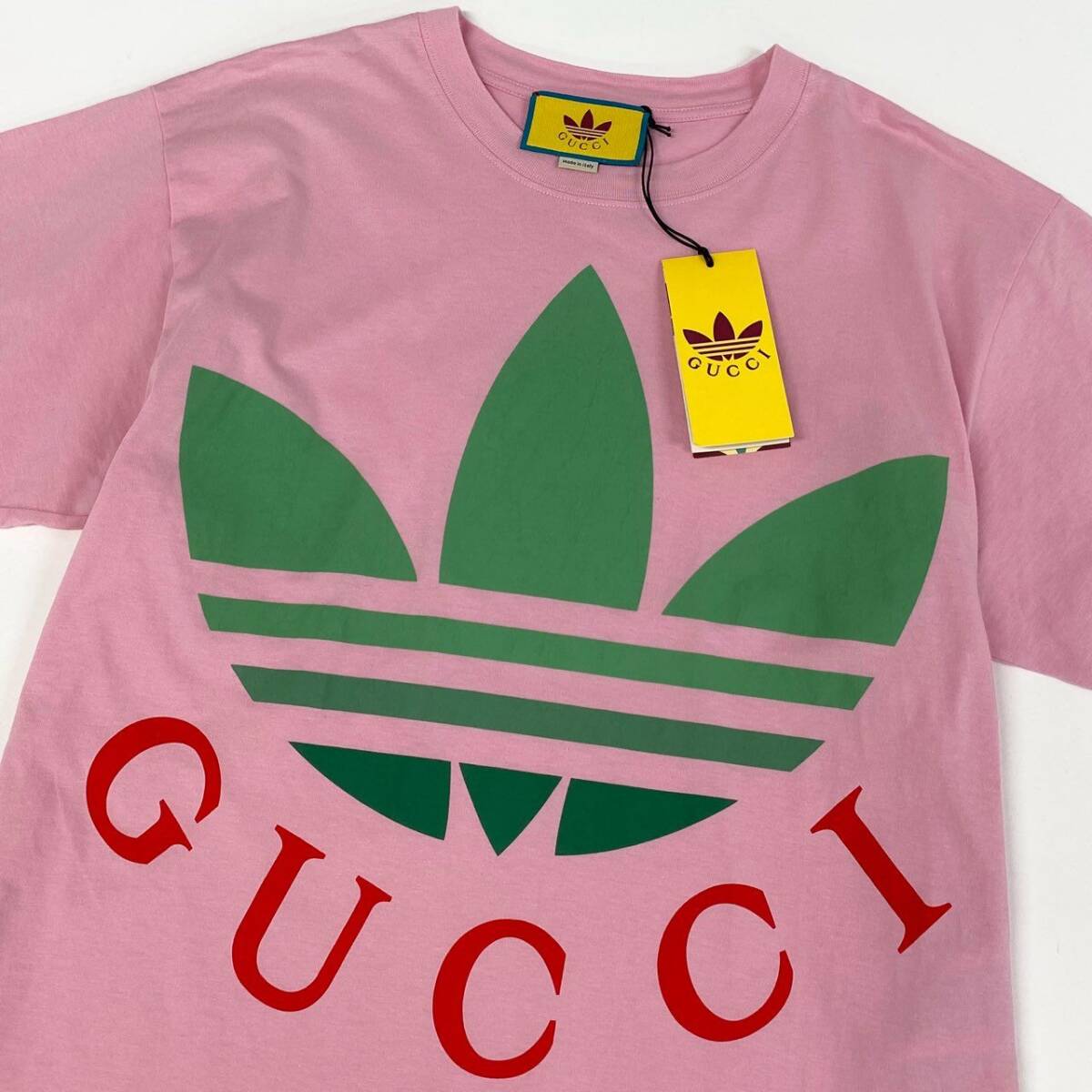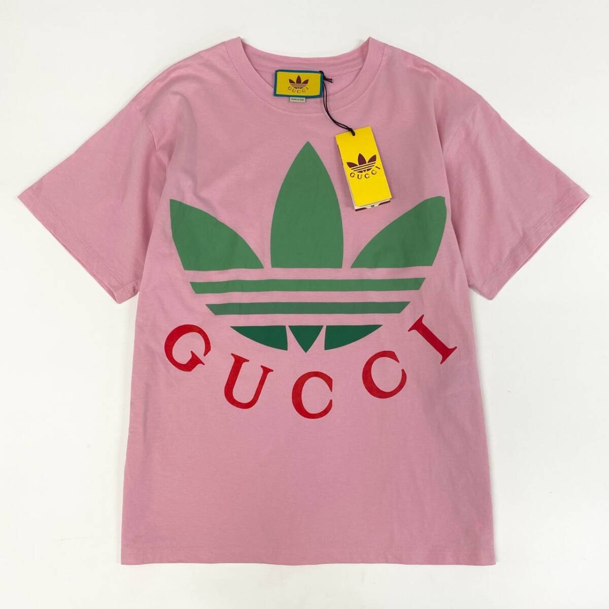スタッフ商品コメント | グッチ × アディダスのコラボTシャツ「723384」です。色味は鮮やかな「ライトピンク」で、フロントにはグリーンのトレフォイルロゴと赤の「GUCCI」ロゴが大胆に配置されたデザイン。素材はマットな質感のコットンで、快適な着心地を実現しています。ユニークなブランドコラボならではの存在感があり、1枚でコーディネートの主役になります。カジュアルスタイルからモードな着こなしまで幅広く活躍するアイテムです。 |