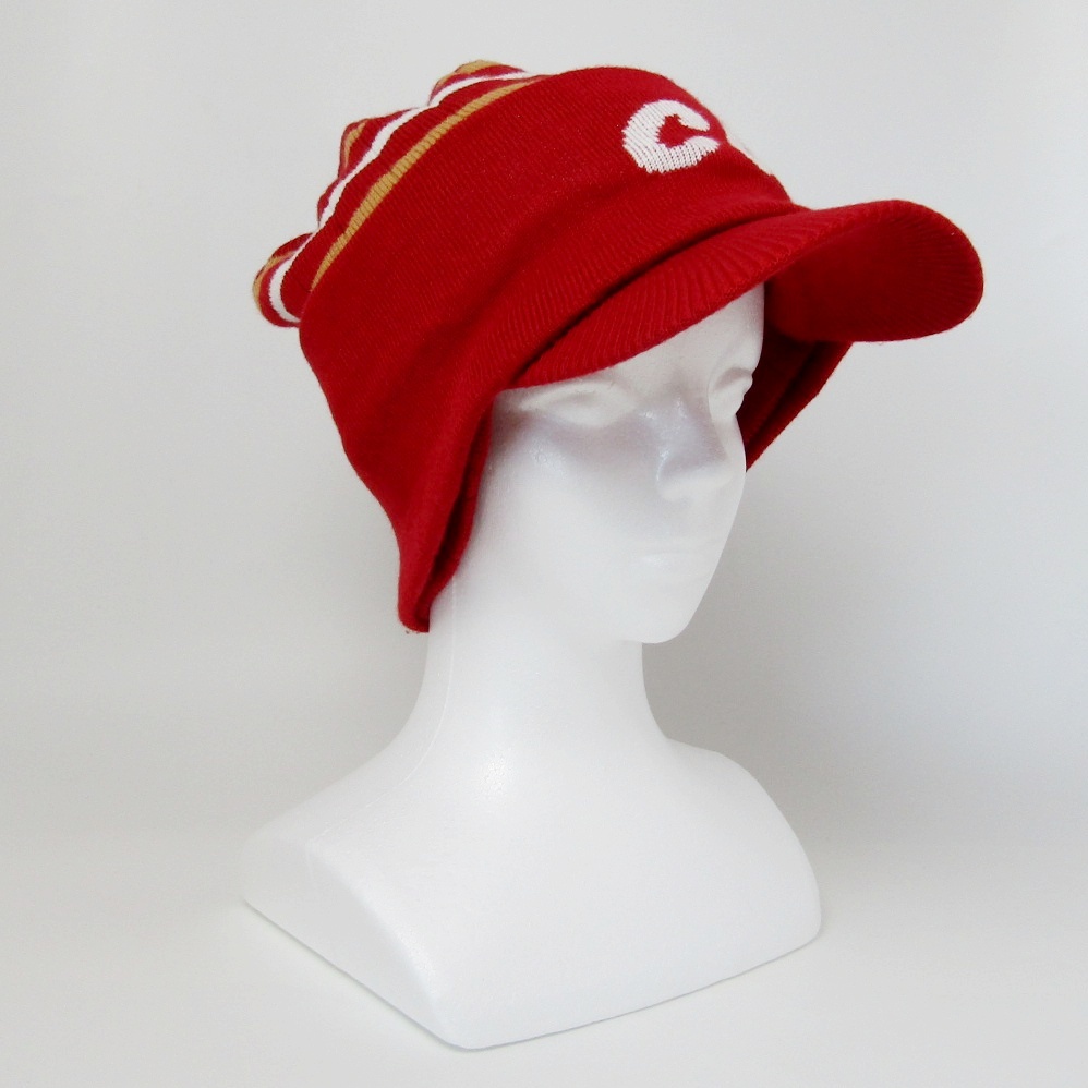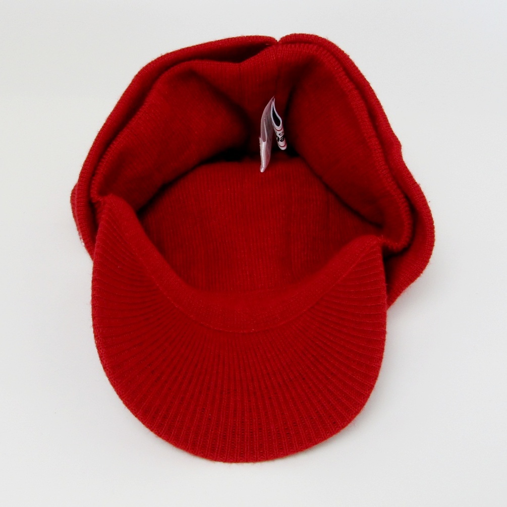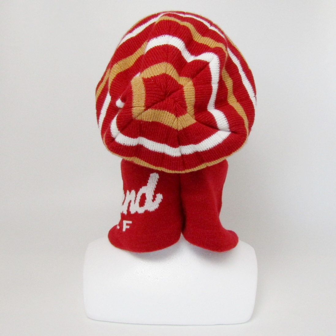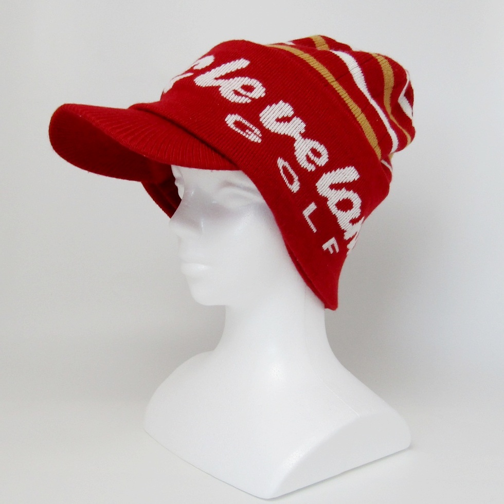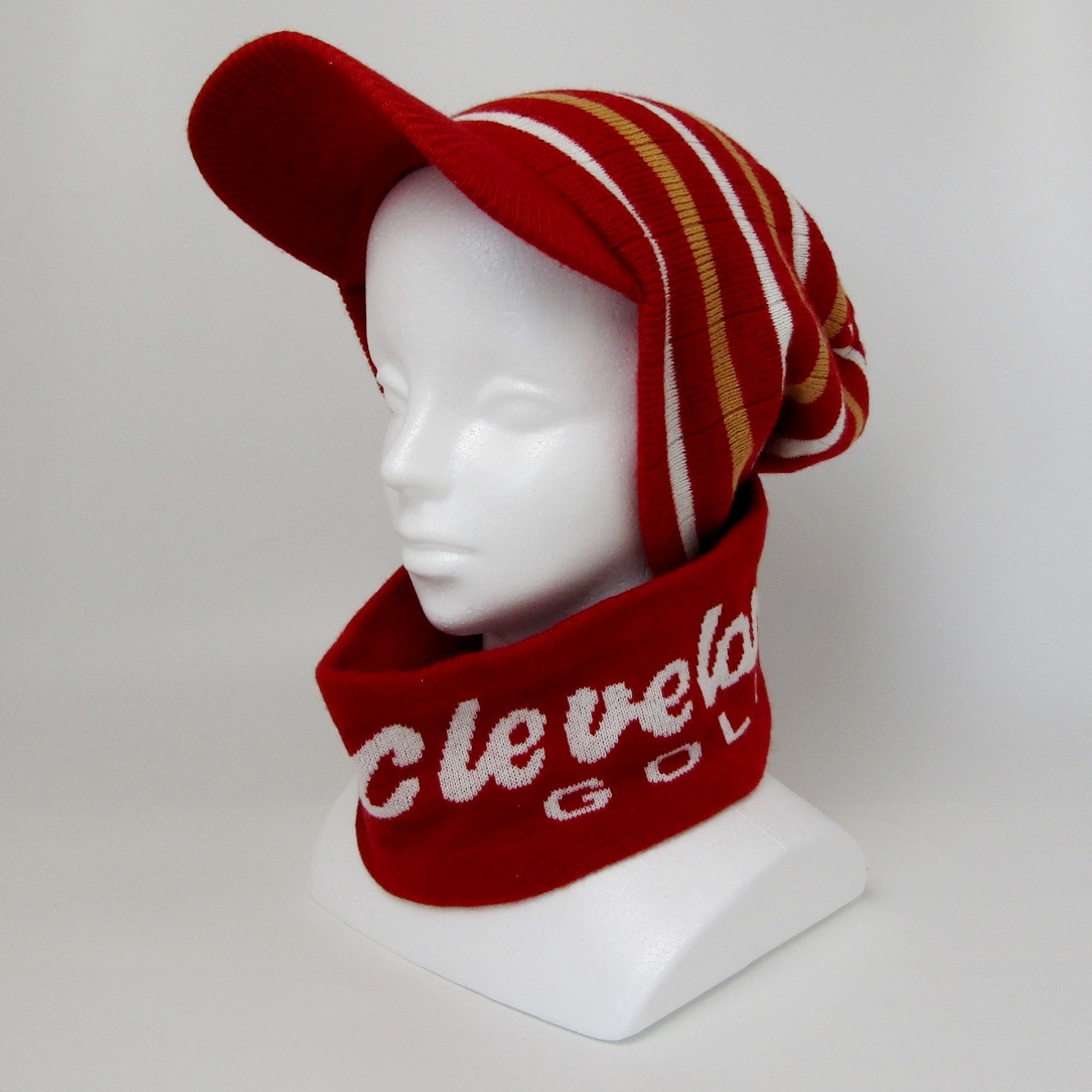 クリーブランドのロゴがあしらわれた、鮮やかなレッドカラーのゴルフニット帽です。