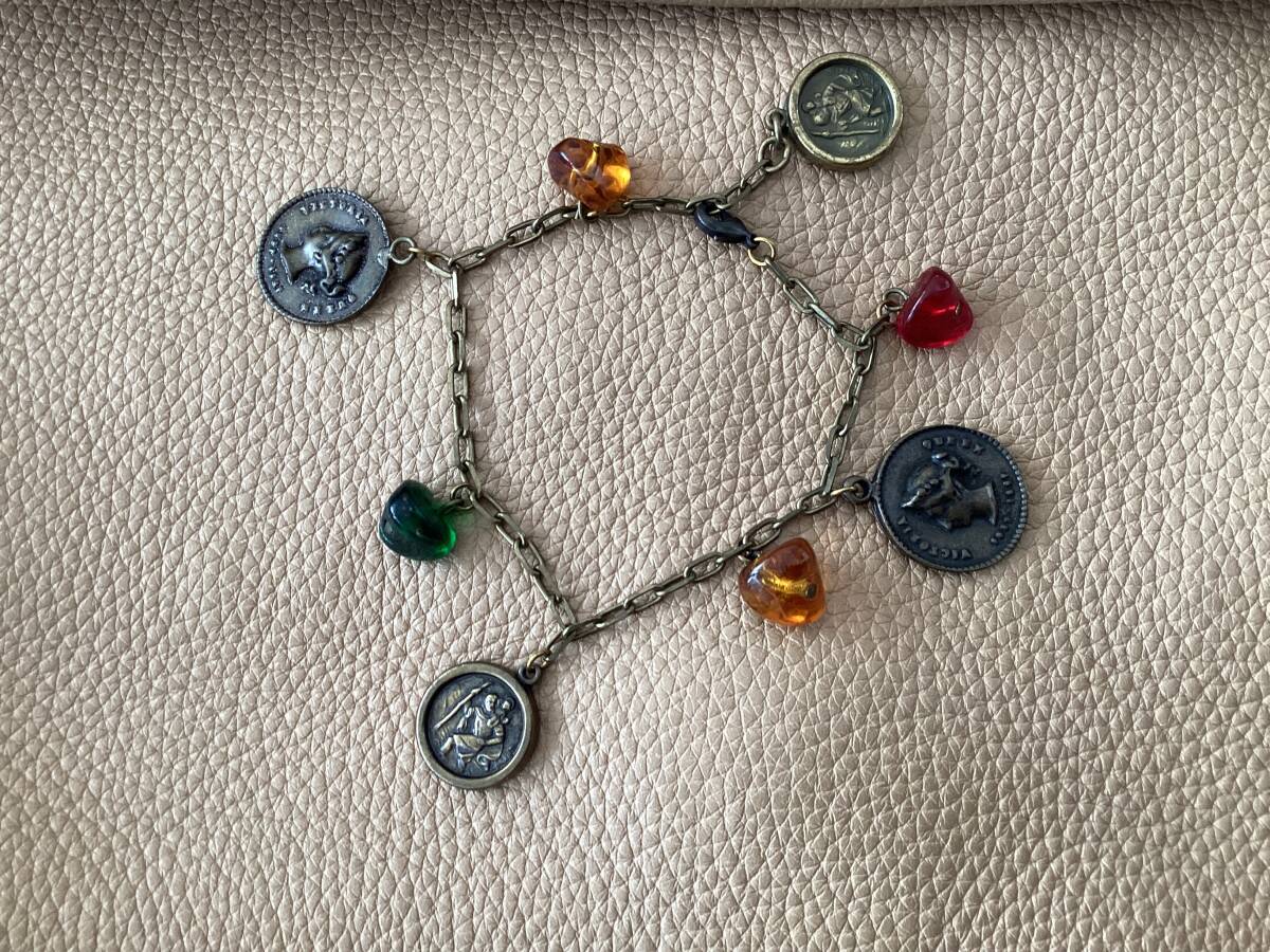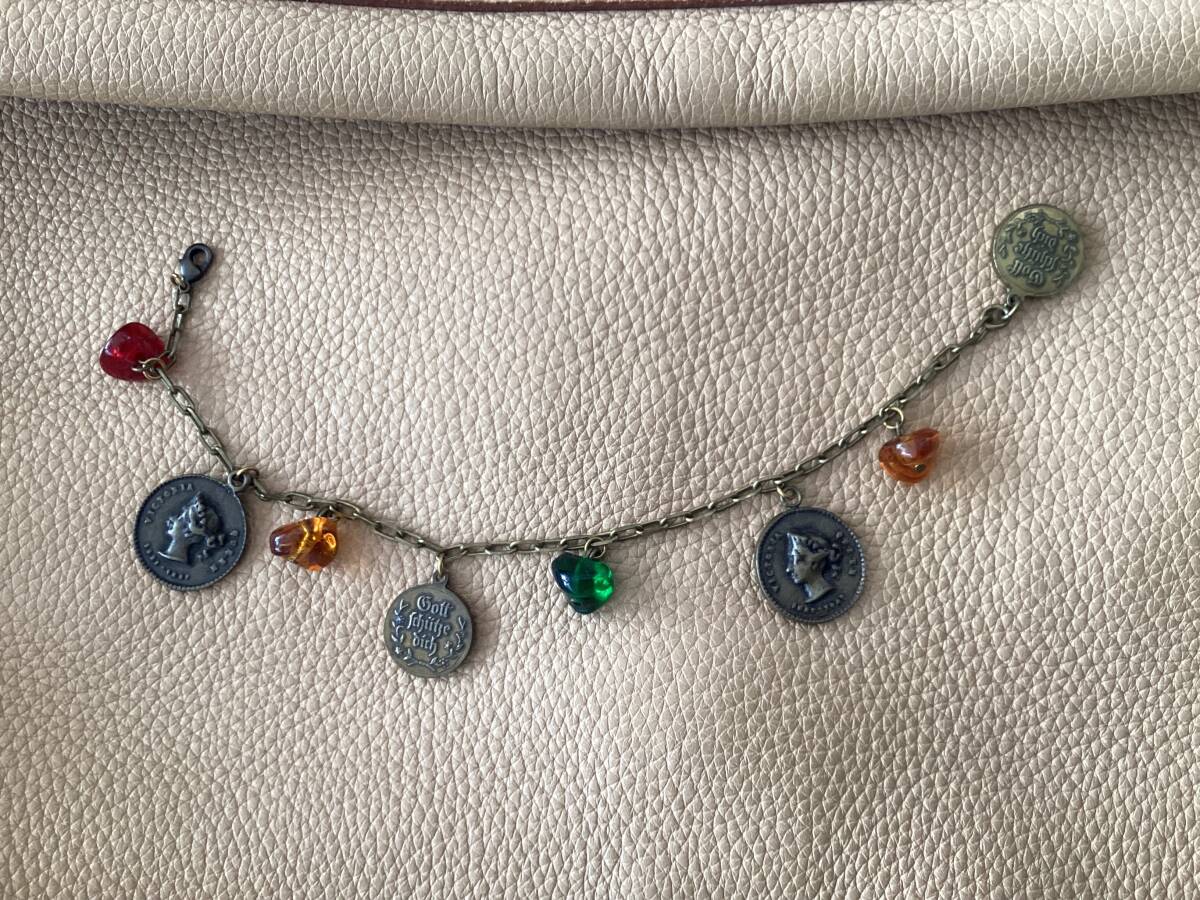 16㎜と20㎜ぐらいのコインモチーフと11㎜ぐらいのガラスモチーフが下がったブレスレットです。