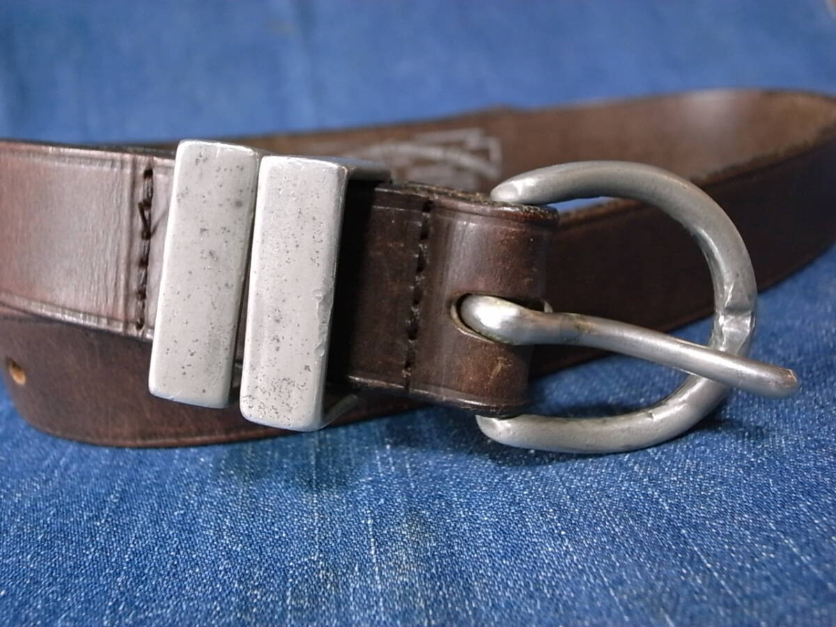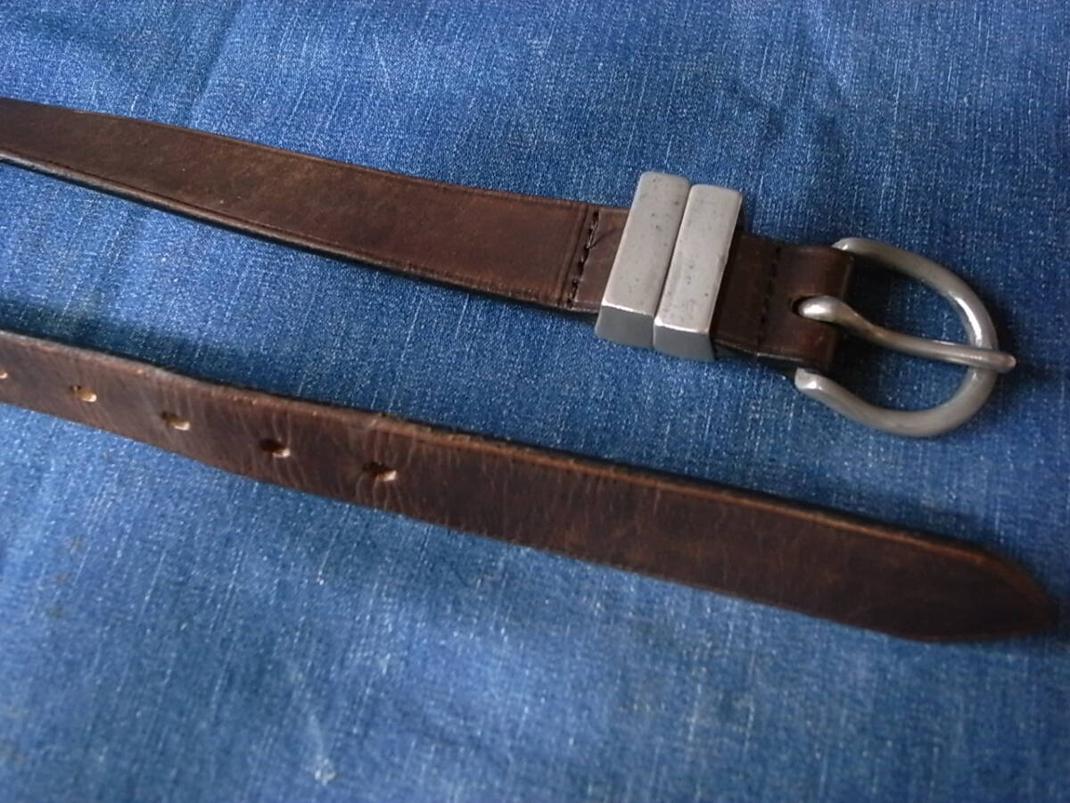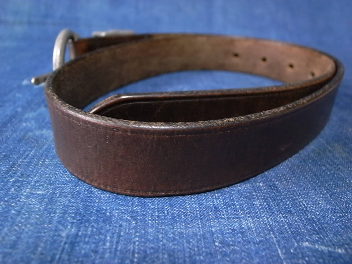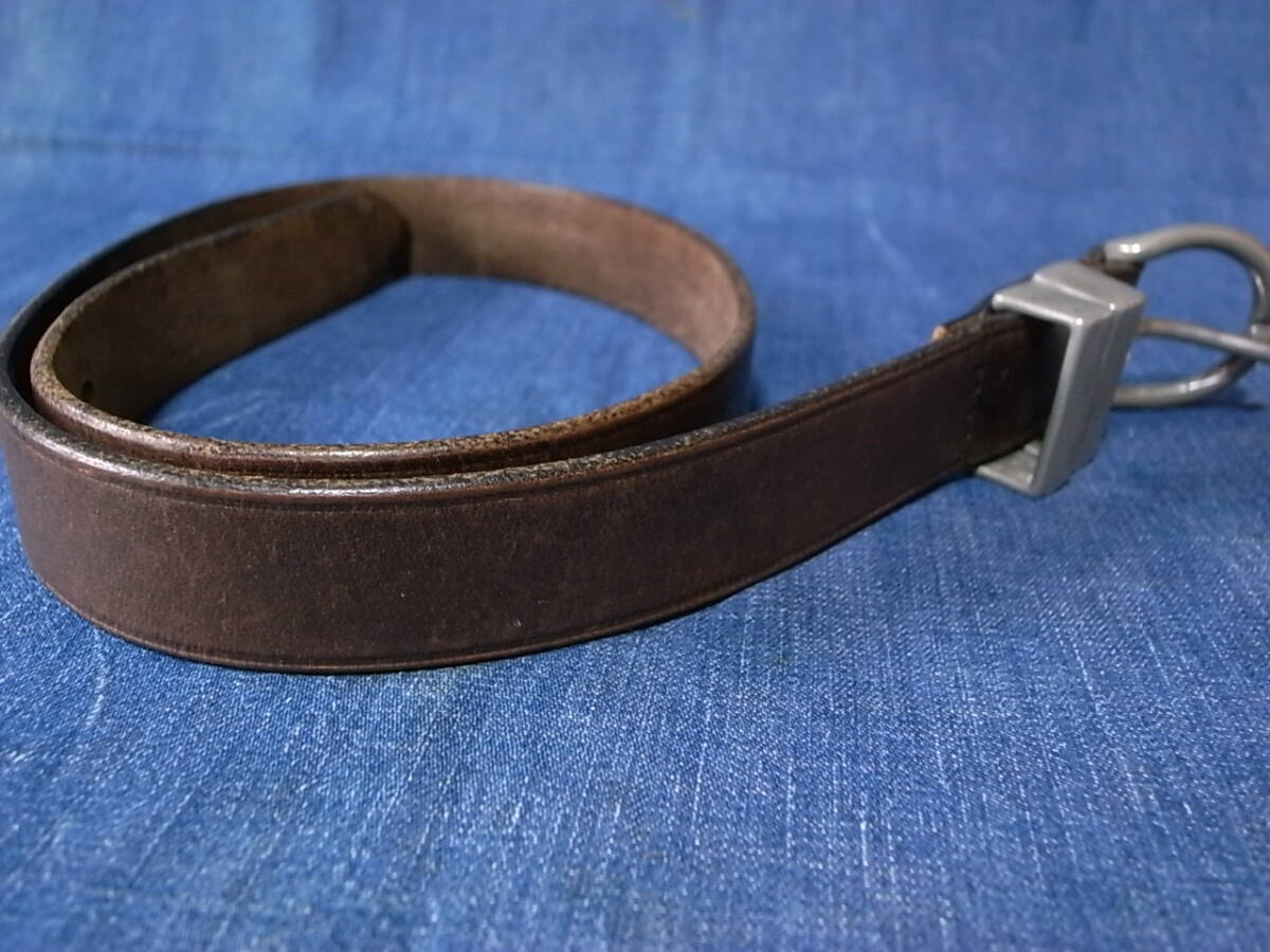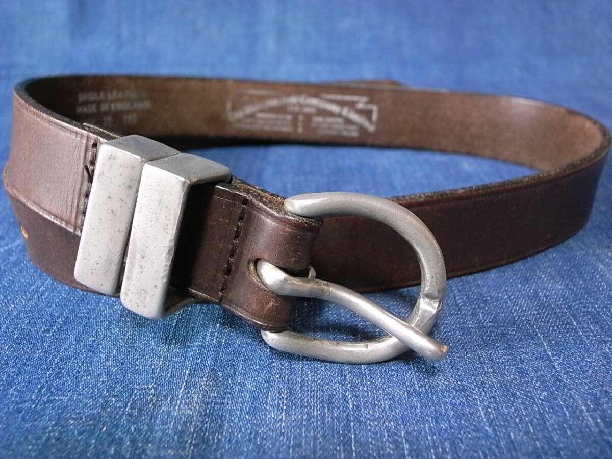 英国職人らしい、馬具用に使われるオイルドレザーを使用したベルト。色はダークブラウン、味のある無骨な金属バックル。