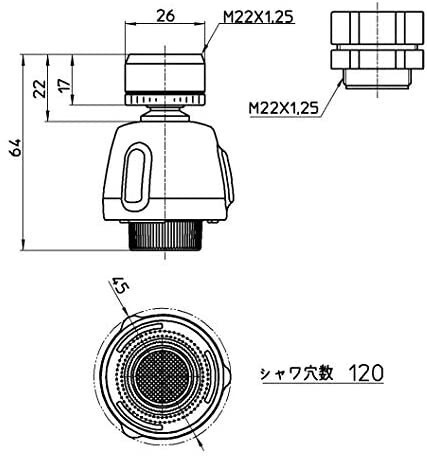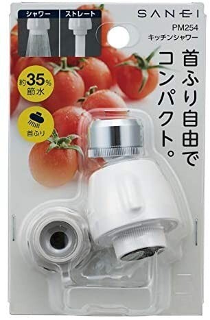 SANEI キッチンシャワー 水流切替 首振り 丸パイプ・外ネジ泡沫適合 節水 PM254 □商品詳細本体サイズ(約):幅4.5×奥4.5×高6.4cm;パッケージサイズ(約):幅9×奥4.5×高14.5cm接続:丸型パイプ取付(先端にふくらみがある16、19mm口径)重量(約):80g最高使用温度60度素材:ABS樹脂、ポリアセタール、黄銅、ステンレス鋼、エチレンプロピレンジエンゴム接続:外ねじ泡沫パイプ取付(M22×1.25)商品重量 :86.2 g接続:先端部にふくらみがある16mm口径のパイプとM22X1.25外ネジ泡沫パイプに取付。