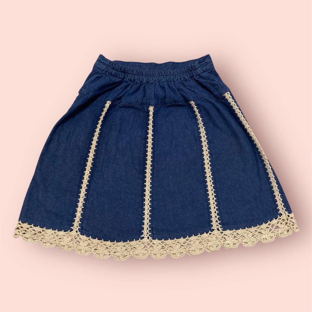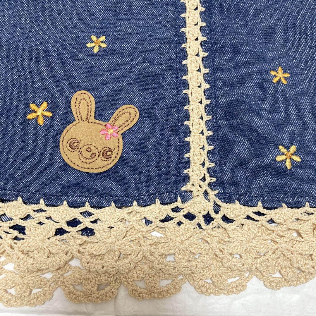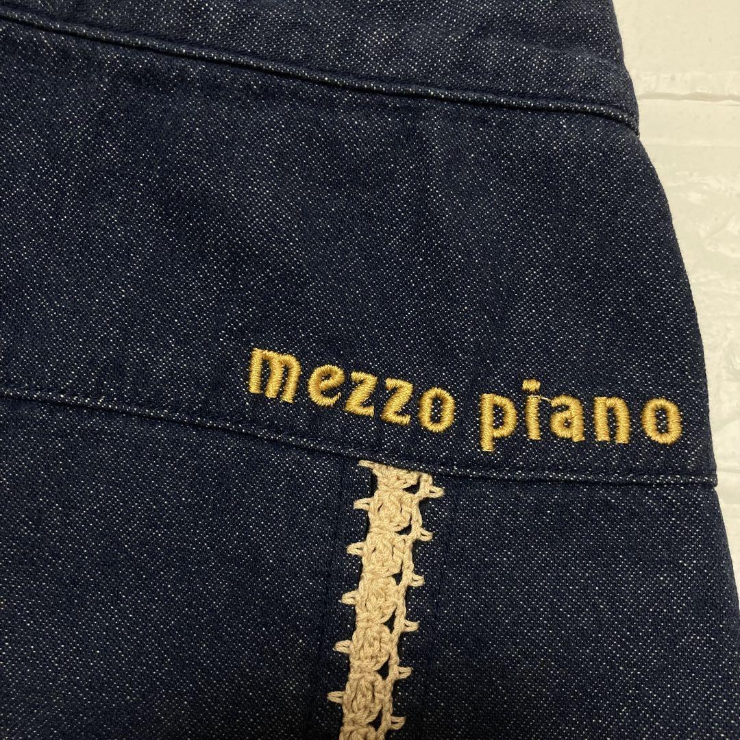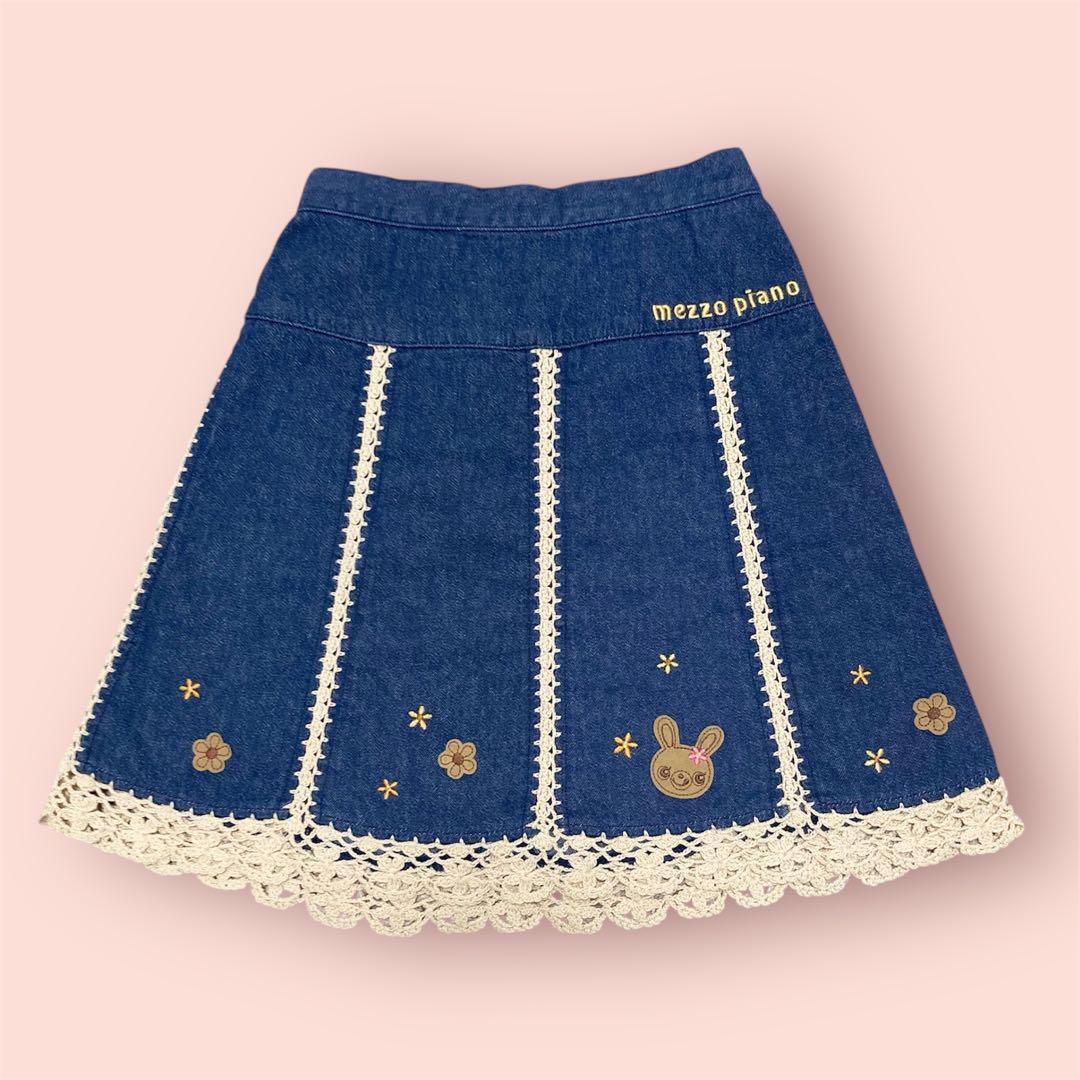 メゾピアノのとても可愛いキャラクターミミポポちゃんのデニムスカートです。裾はレースになっています。昔の物で旧タグでレア物です。mezzo pianoのブランドロゴの刺繍もあります。