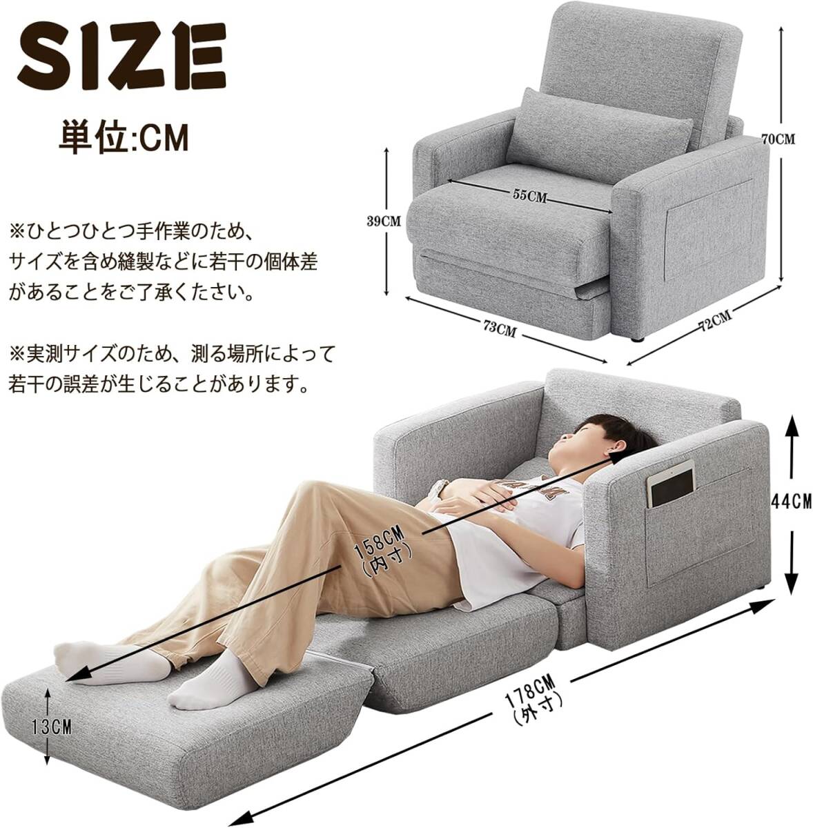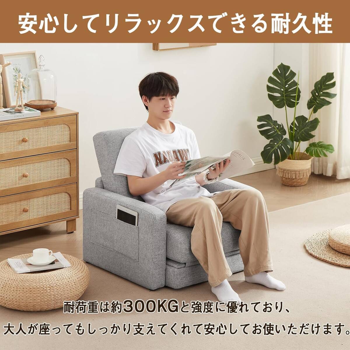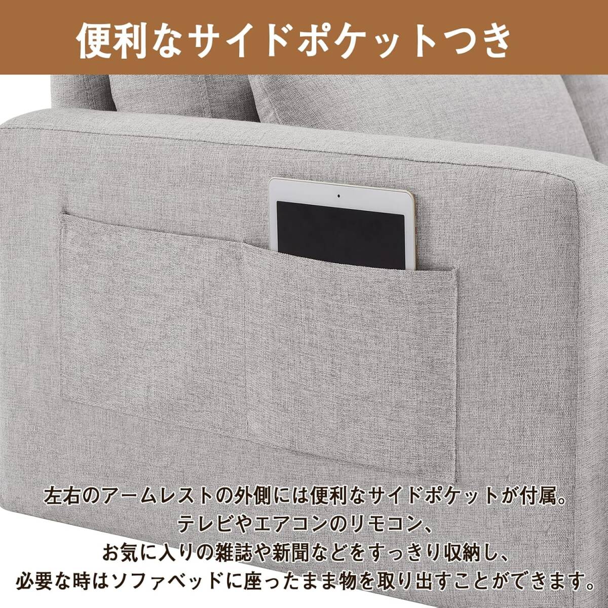 • ソファースマートなコンパクトソファーベッド フロアソファ 。肘掛け部分に大容量収納ポケットを完備し、リモコンや雑誌、小物までスッキリ収納可能!高反発スポンジで快適な座り心地を提供し、布張り生地は簡単に外せて洗濯できるため、日常のメンテナンスも楽々。折りたたみ式のデザインで収納性抜群、コンパクトながらもダブル機能を備えたこのソファーは、小規模な住空間やマンションのリビング、ワーキングスペースに最適です。居心地の良いくつろぎスポットを手軽に作り上げましょう!