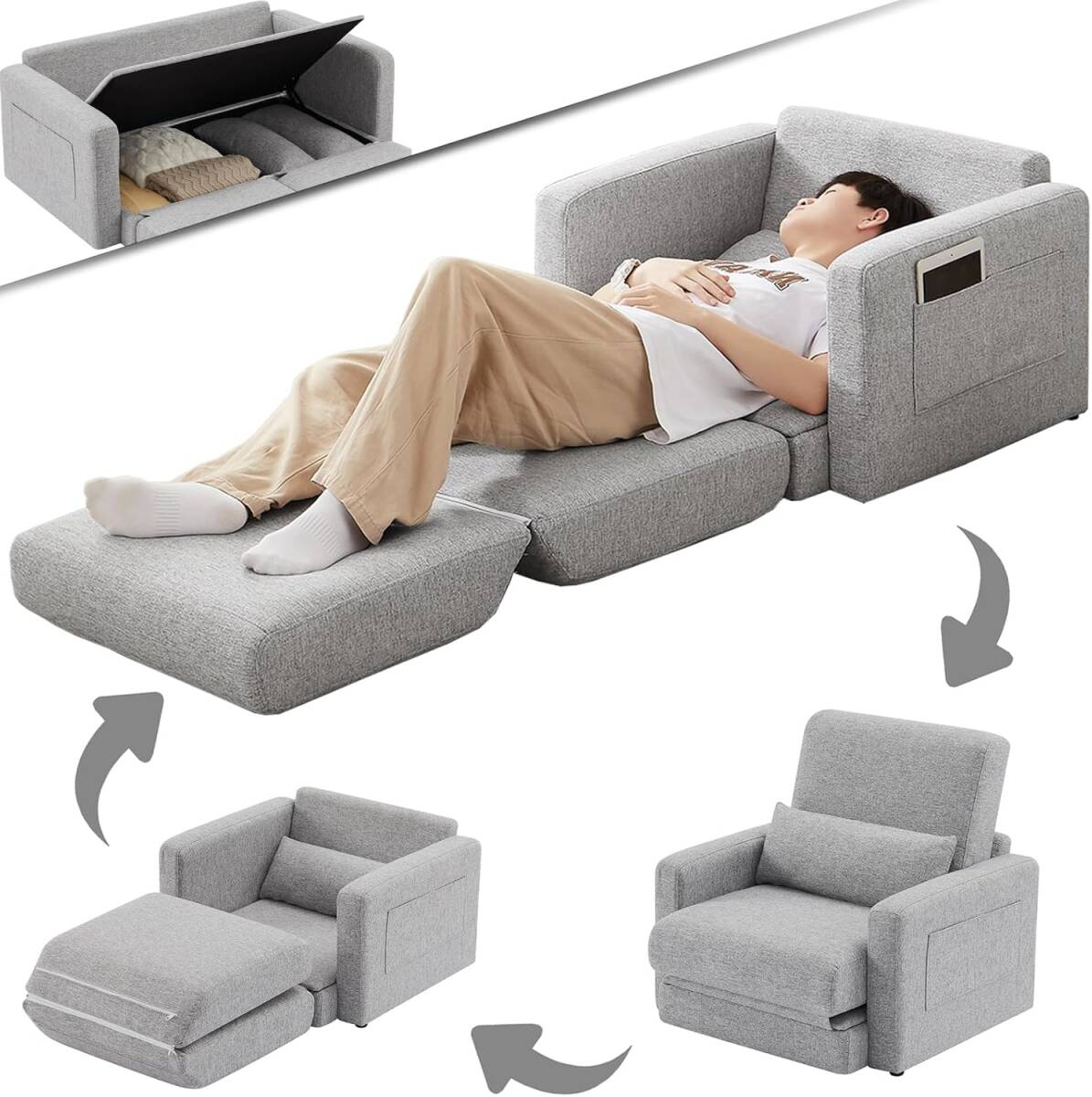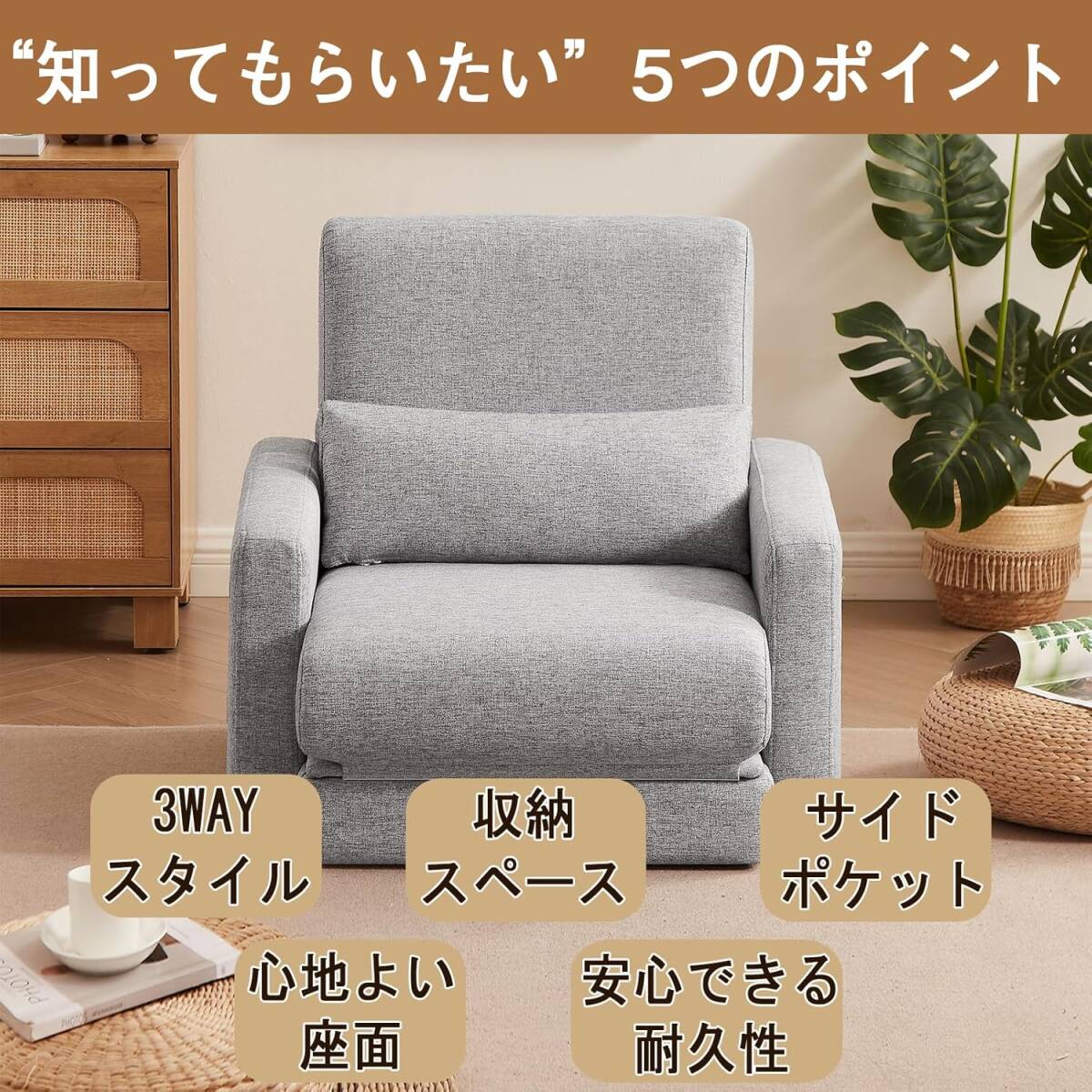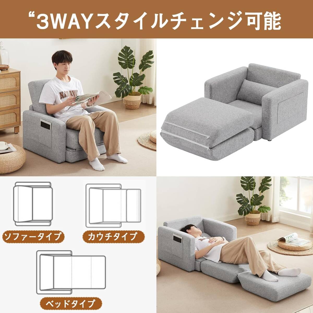 3WAY ソファーベッド 1人掛け 収納付き ローソファー ベッド 折りたたみ カウチソファー 一人用 コンパクト (ライトグレー・1人掛け)