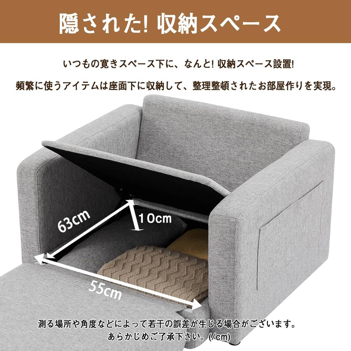 • ダブルシートの 1 人掛けソファは、収納機能と快適性を完璧に融合させたデザインです。クッション下には大容量の収納スペースを備え、雑誌や布団、小物をすっきり収めることができます。付属のオットマンは足を伸ばしてくつろぐことができるほか、必要に応じて脚を外してテーブルとしても利用できます。柔らかなファブリック生地が肌触りを向上させ、肘掛けデザインで快適なリラックスタイムをサポート。木脚は簡単に取り外せるため、移動やクリーニングもスムーズで、部屋のレイアウト変更にも柔軟に対応できます