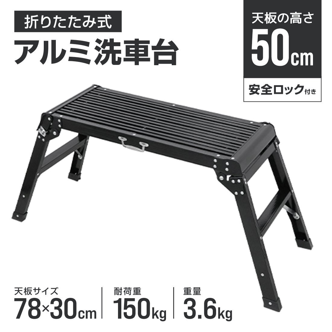 洗車や掃除などの高所作業に大活躍! 天板裏とステップには金具で補強を施し、安心して作業できる強度を実現しました。 \その他、安心安全ポイント/ ・天板、ステップ、脚キャップに滑り止め加工済 ・しっかり固定できる安全ロック搭載! ・幅広ステップで安定感抜群 ・安心の耐荷重150kg 女性でも片手で持ち運べる軽量設計! また、ブラックには持ち手付きで持ち運びやすさ抜群です。 水に濡れてもサビにくく丈夫なアルミ製で、様々な作業に使用可能。 その他、荷物置きや作業台、ベンチとしてもご使用いただけます☆ 【商品仕様】 《サイズ(約)》 全体:幅108.5×奥行40×高さ50cm 天板:幅78×奥行30cm 折りたたみ時:79×16.5cm 重量(約):3.6kg 耐荷重(約):150kg 材質:アルミニウム、ABS樹脂、プラスチックメッキ (アルミ足場台 アルミ脚立 アルミ洗車台 ラダー アルミラダー 高所作業 掃除 そうじ 大掃除 雪おろし ガーデニング 作業 洗車 日曜大工 避難 多目的はしご 折り畳み 人気 おすすめ WEIMALL) |