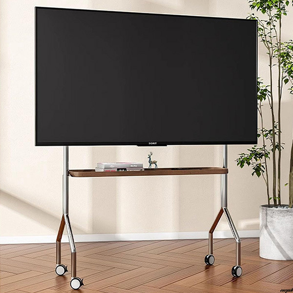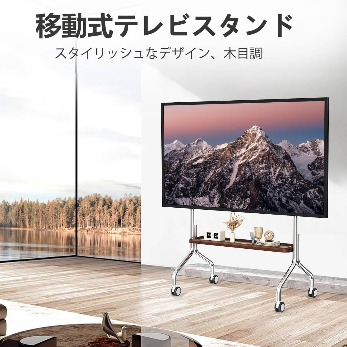 【ステンレス製キャスター付テレビスタンド】 テレビ台 32~75インチ対応 耐荷重50kg 省スペース 移動式 木目棚付き 自立型