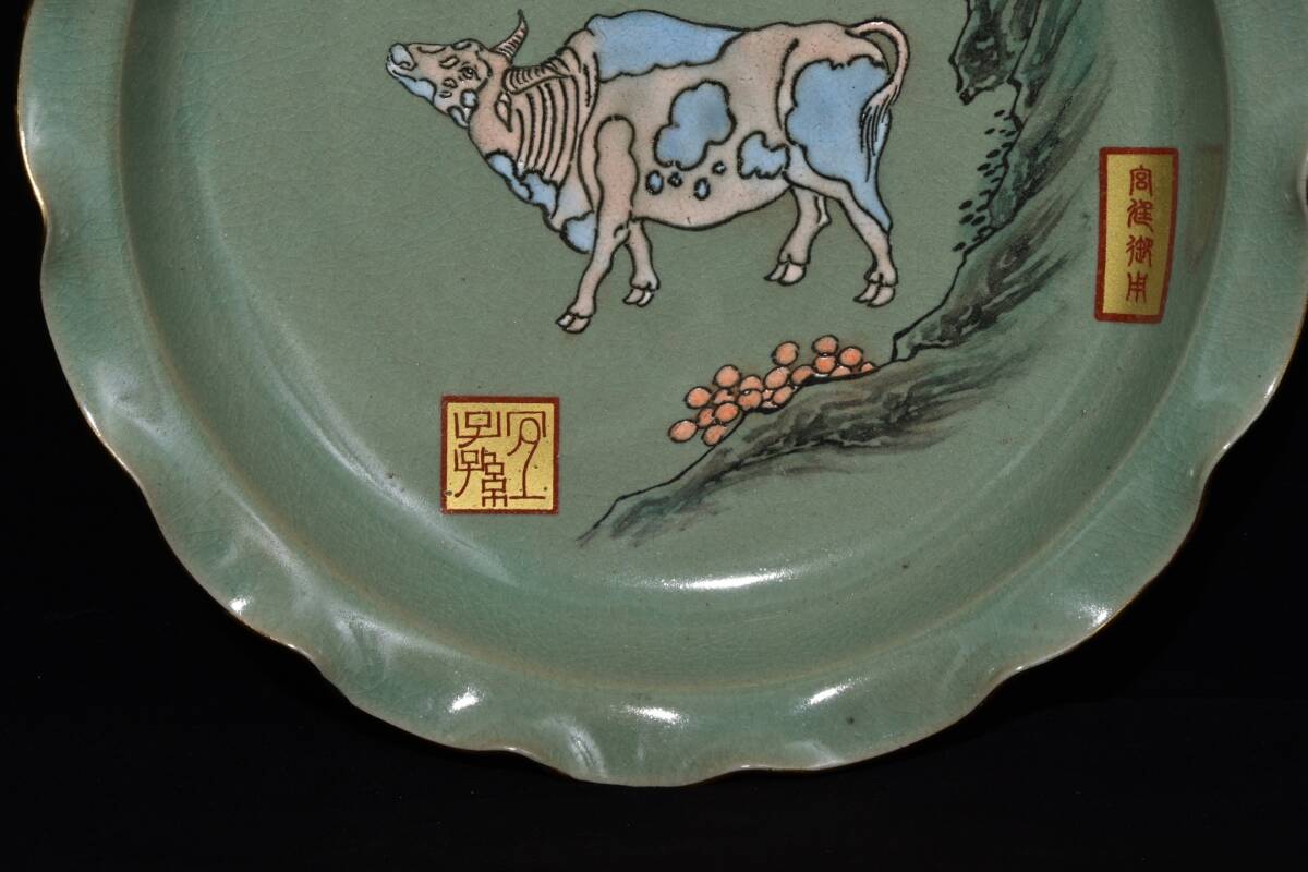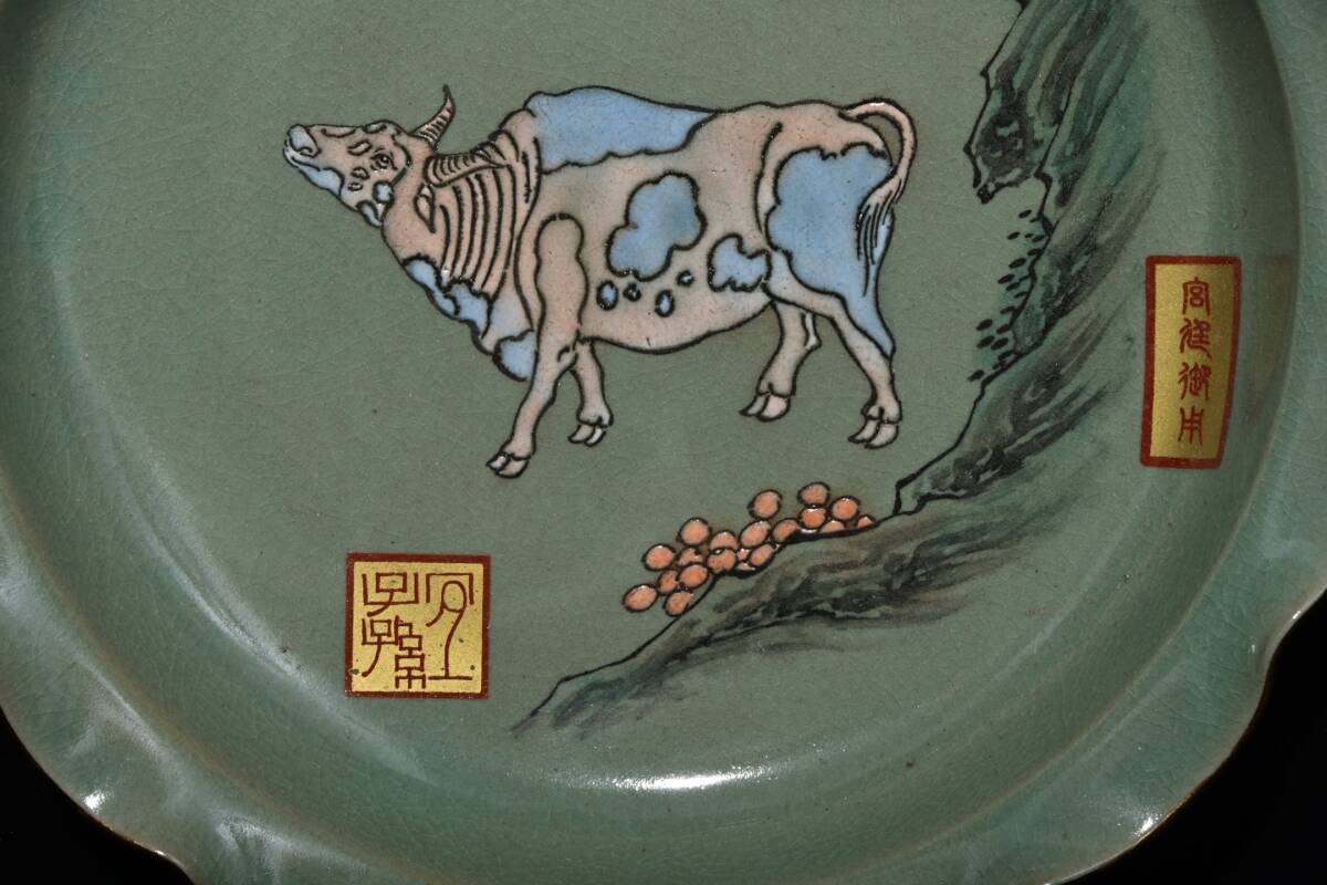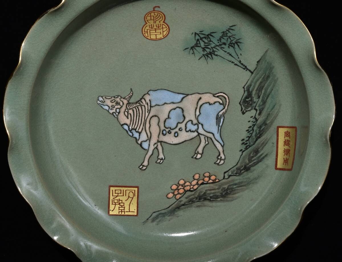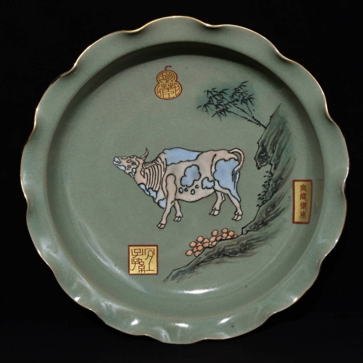 *珍品旧蔵* 宋 汝窯 エナメル彩描金牛紋 賞皿 陶芸 古陶磁器 中国磁器 極細工 唐物 中国古玩 骨董品 古美味 H49