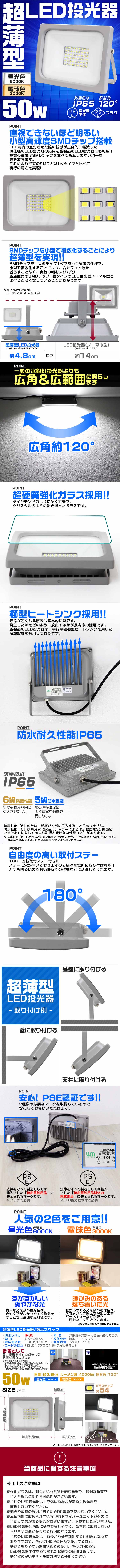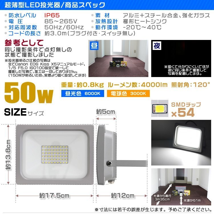 | 消費電力 : 50W (500W相当) ルーメン : 4000LM 防水レベル : IP65 照射角 : 広角120° 重量(約) : 0.8kg |