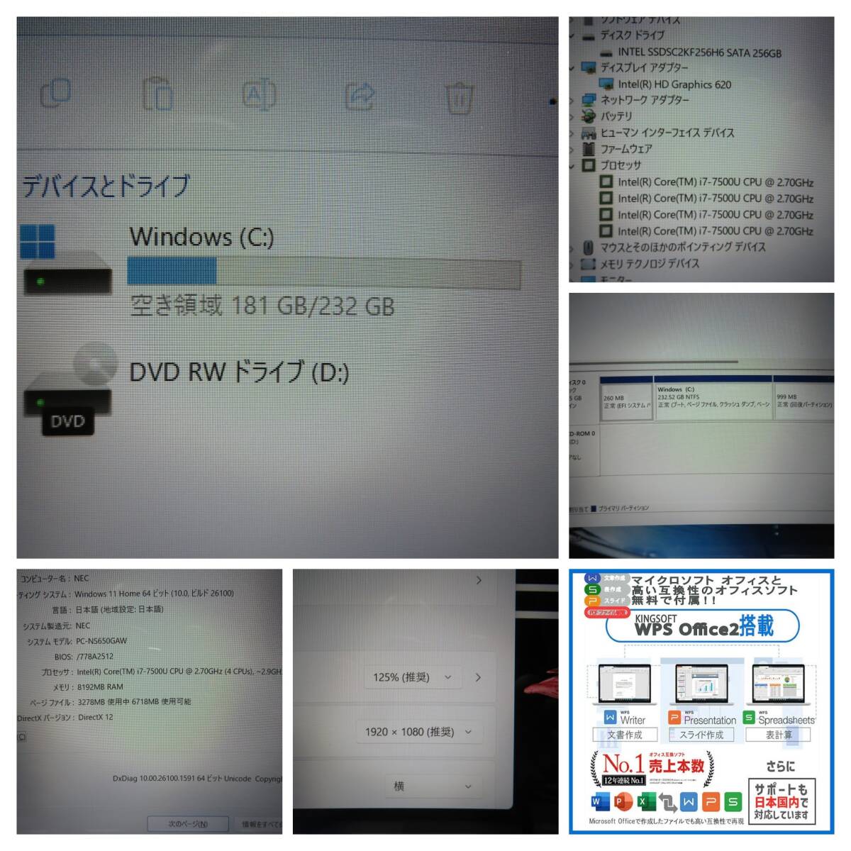 高性能 Intel 高性能 Core i7-7500U  + 高速起動 SSD 256GB SSD + メモリ 8GB + Windows 11 Home
