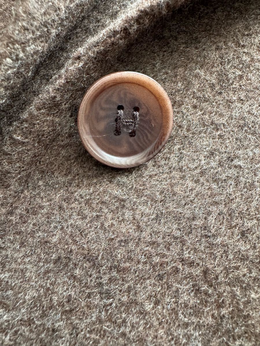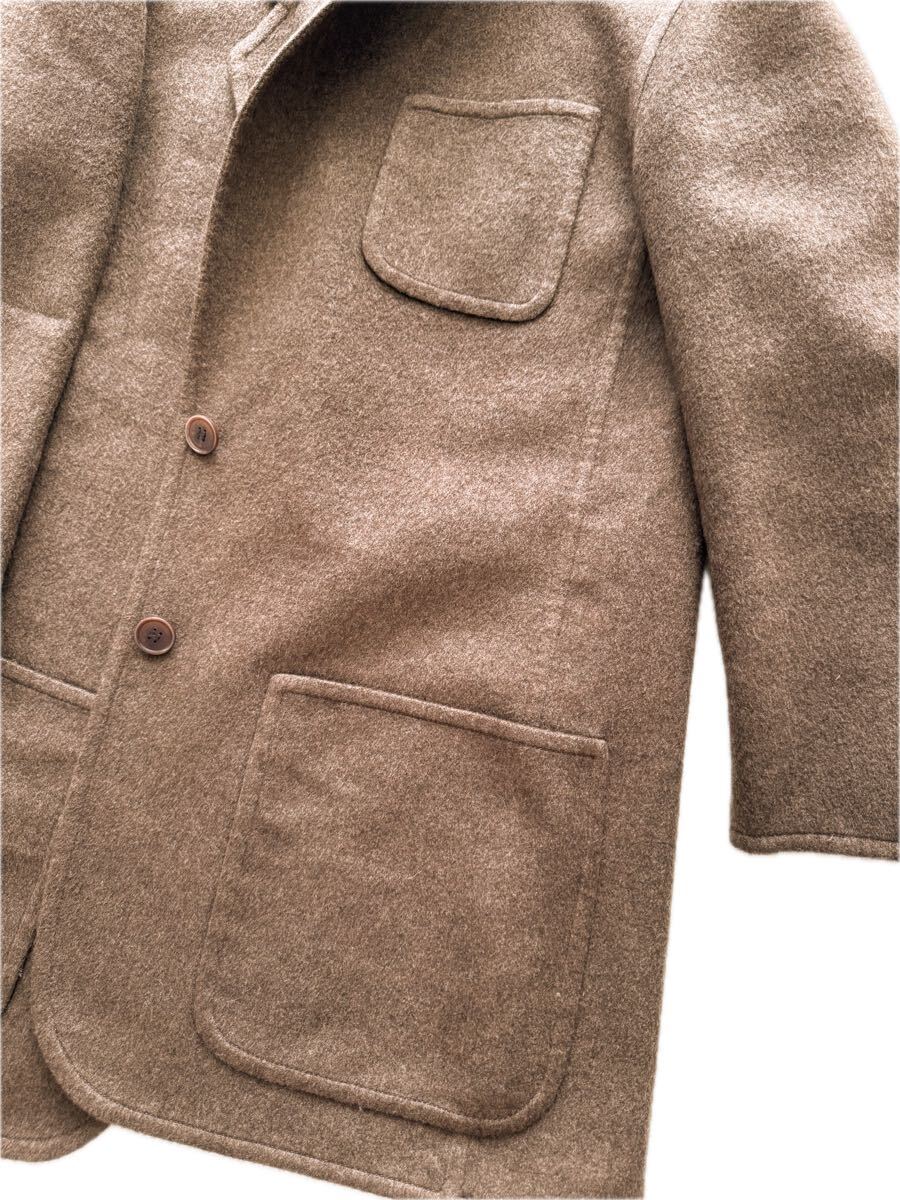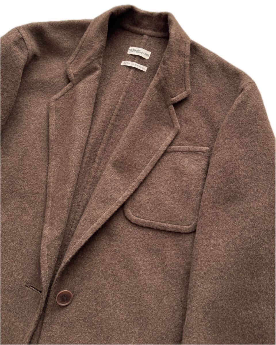 少し起毛した風合いの良い最高級のカシミヤ生地(ダブルフェイス?)を使用しゆったりオフショルダーのリラックス感あるシルエットにミニマムなデザインが雰囲気抜群でとてもお洒落なジャケット、ブレザーになります♪♪