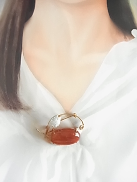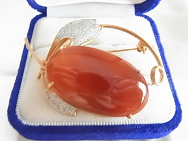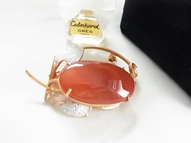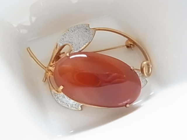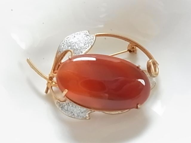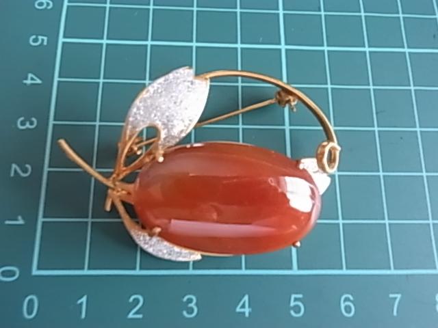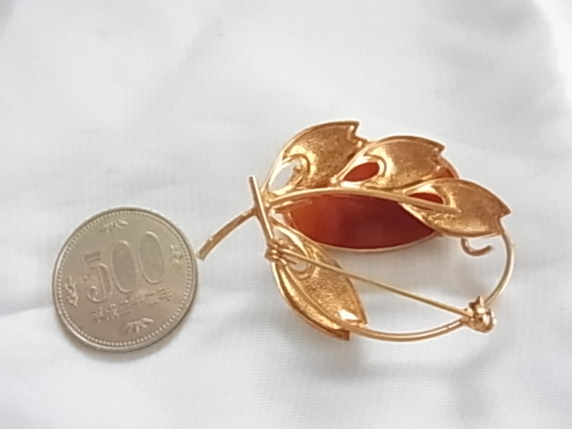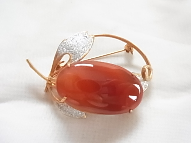 ビンテージ/ヴィンテージ 赤瑪瑙調の大粒のストーン 品質不明 ラメ入りシルバートーンのリーフとのコンビデザイン レトロブローチ♪♪