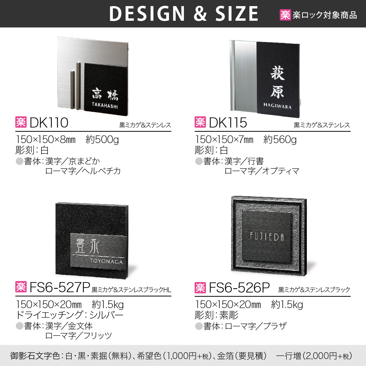 | 取付方法 | ボルトタイプ:表札裏ボルトと接着剤でのお取り付け。 楽ロック:ボルトと楽ロック専用金具でのお取り付け。 |