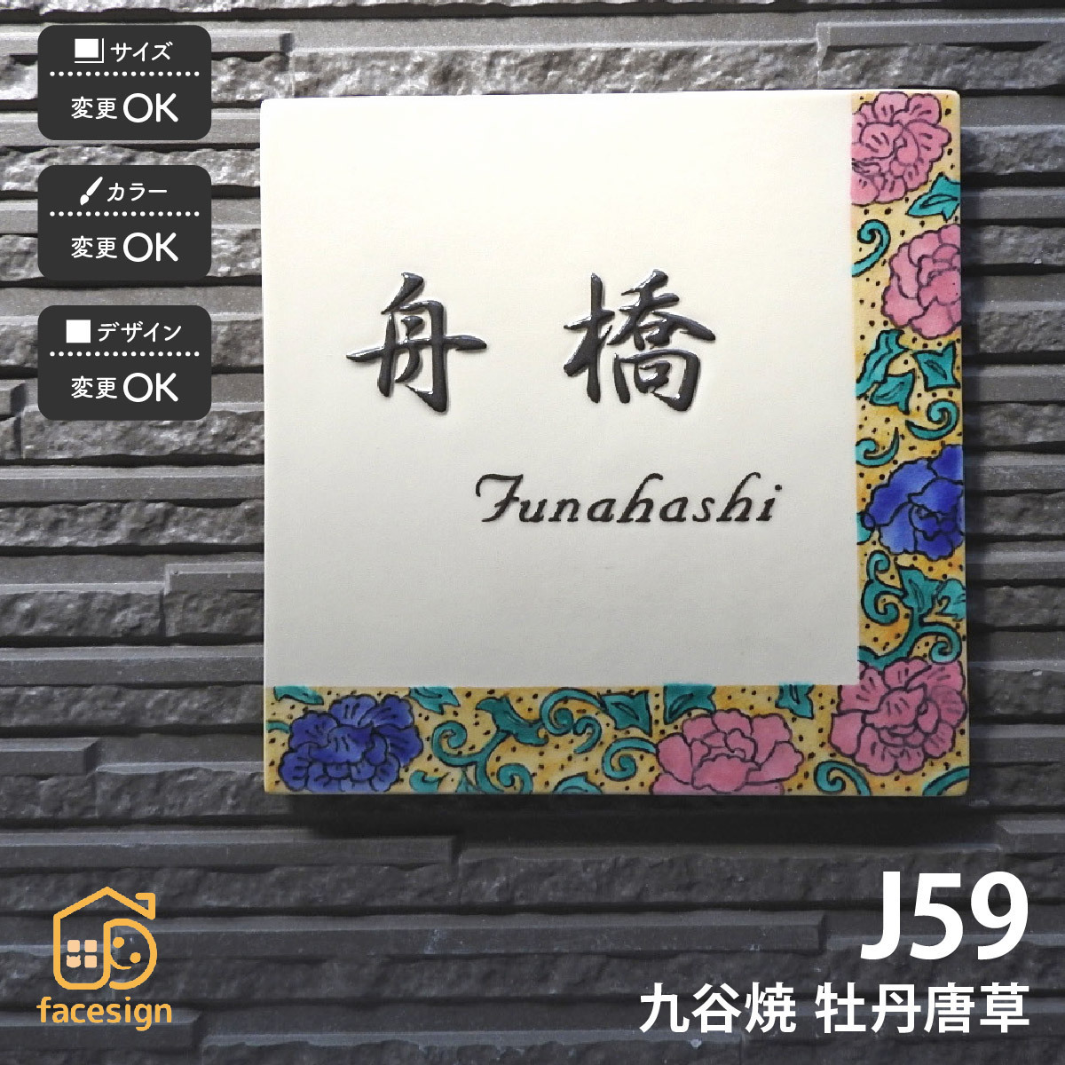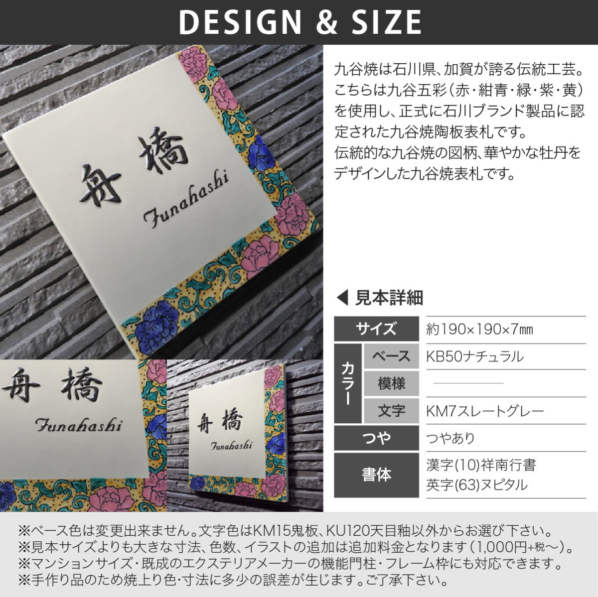 | 商品詳細 | 九谷焼は石川県、加賀が誇る伝統工芸。こちらは九谷五彩(赤・紺青・緑・紫・黄)を使用し、正式に石川ブランド製品に認定された九谷焼陶板表札です。伝統的な九谷焼の図柄、華やかな牡丹をデザインした九谷焼表札です。 |