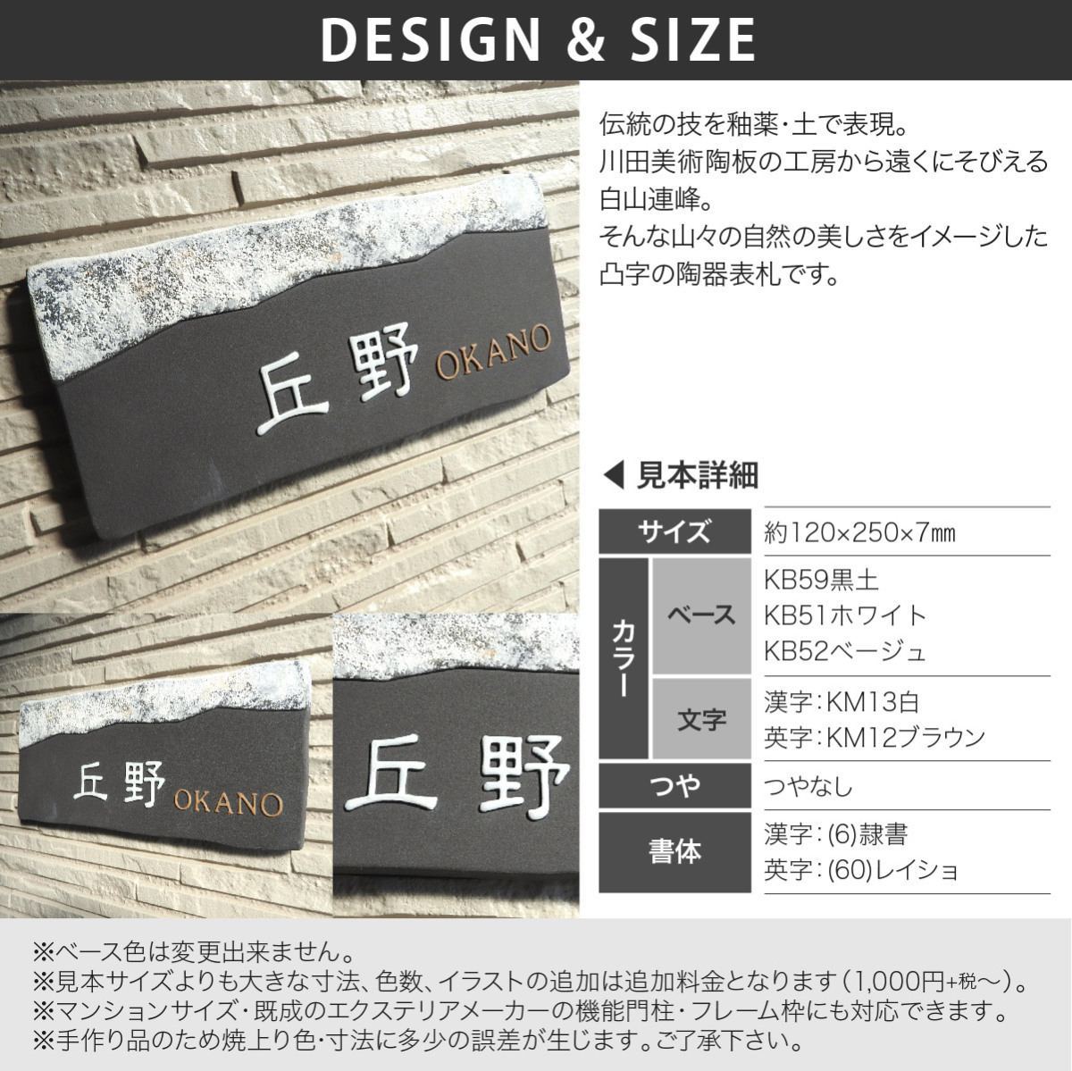 商品詳細 | 伝統の技を釉薬・土で表現。川田美術陶板の工房から遠くにそびえる白山連峰。そんな山々の自然の美しさをイメージした凸字の陶器表札です。 |