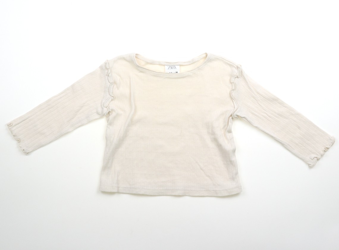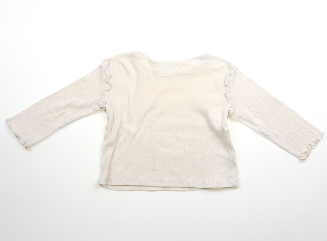 実際のサイズ表記は98cmです。品質タグが切られています。丈が短めです。サイドネックポイントからの総丈約29.5cmです。アイレットフライスカットソー生地。目立つ汚れはありません。