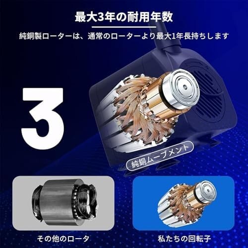 【超静音設計】淡水と海水に共通する高性能ステンレス鋼軸心を採用し、水とポンプ壁の間の摩擦と共振を低減する。