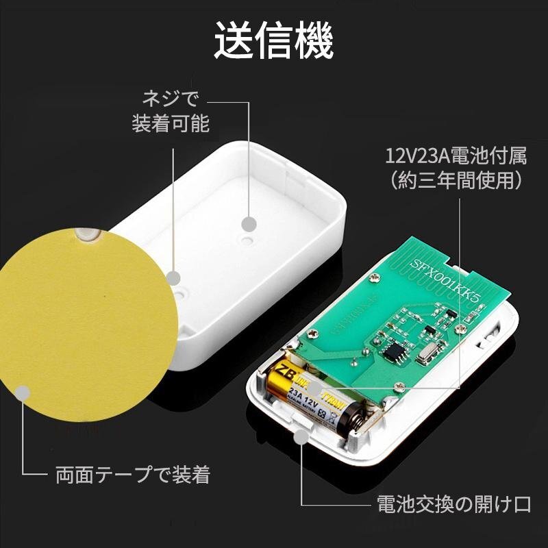 • 取り付けはラクラク:この玄関チャイムは配線工事不要で、ドアチャイム受信機はバッテリー式で、送信機をドアフレームに固定し(両面テープでの接着可能)ボタンを押すだけでチャイムが流れます。工事なしでも設置できてしまうので、とても手軽です。お子供と年寄りの方も使用できます。