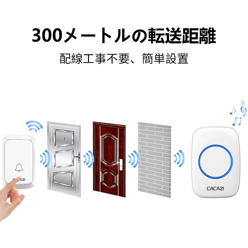 安定な転送:こちらの呼び出しチャイムは障害のない場所で、ワイヤレス通信が最大300メートルの長距離まで届けます。高感度受信機で、壁、木ドアー、鋼ドアーなどに安定受信でき、2階建ての建物でもご使用いただけます。