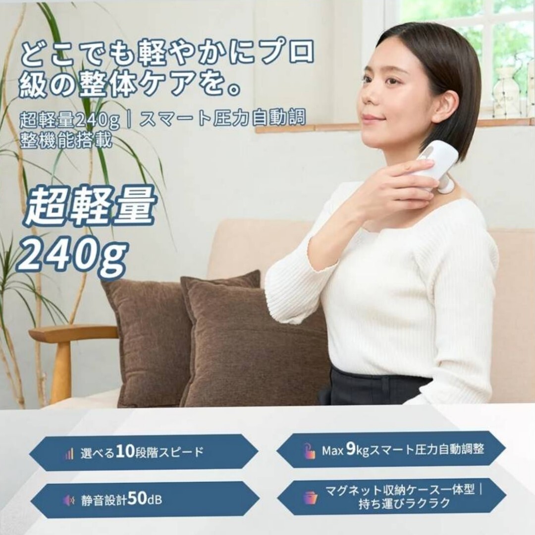 本体重量はわずか240グラムの超軽量設計で、あらゆる年齢層や性別の方に使いやすくなっています。手の小さな女性でも握りやすい形状で、素材には滑り止め加工を施し安心してお使いいただけます。静音モーターを搭載しているため、オフィスや夜間でも周囲を気にせず快適にご利用可能です。サイズは125×70×42mmで、スタイリッシュなデザインも魅力の一つのミニ筋膜リリースガンです。
