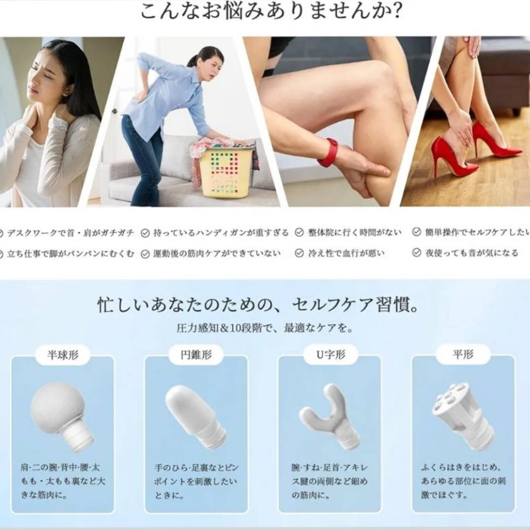 【 用途に応じて使い分ける4種類アタッチメント】半球形、円錐形、U字形、平形の4種ヘッド付き。背中や足裏、腕、フェイスラインなど部位に合わせて使い分けることで、プロのようなセルフケアを手軽に実現できる筋膜リリースです。