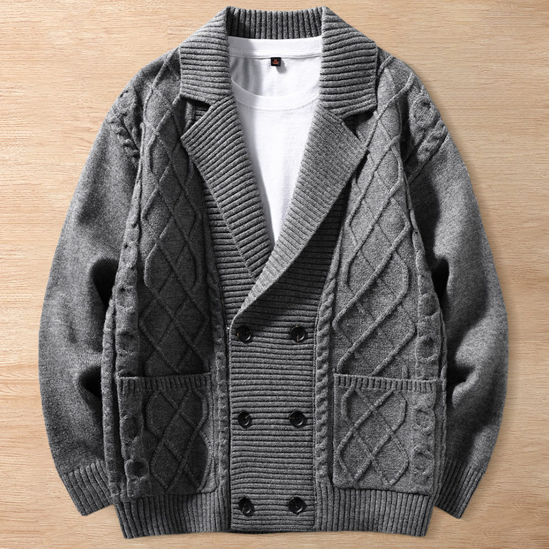 Y6406-XL グレー 新品 カーディガン ウール混 ニット セーター ケーブル編み 柔らか 暖かさ 秋冬 厚手 メンズ カジュアル トップス