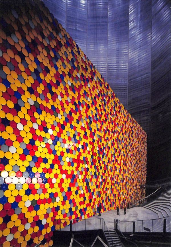 1999年にドイツのオーバーハウゼンという都市で実現した大規模屋内インスタレーション作品、1万3000個のドラム缶を積みあげた「ザ・ウォール」の実現した姿を捉えたカードです。