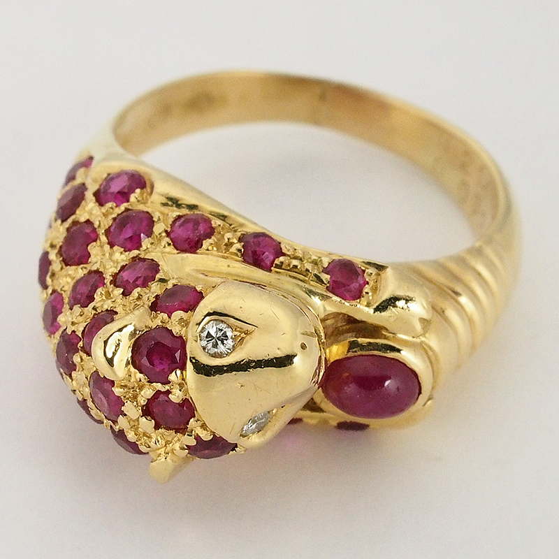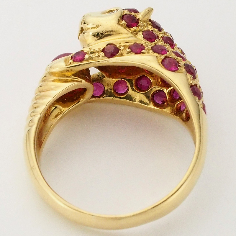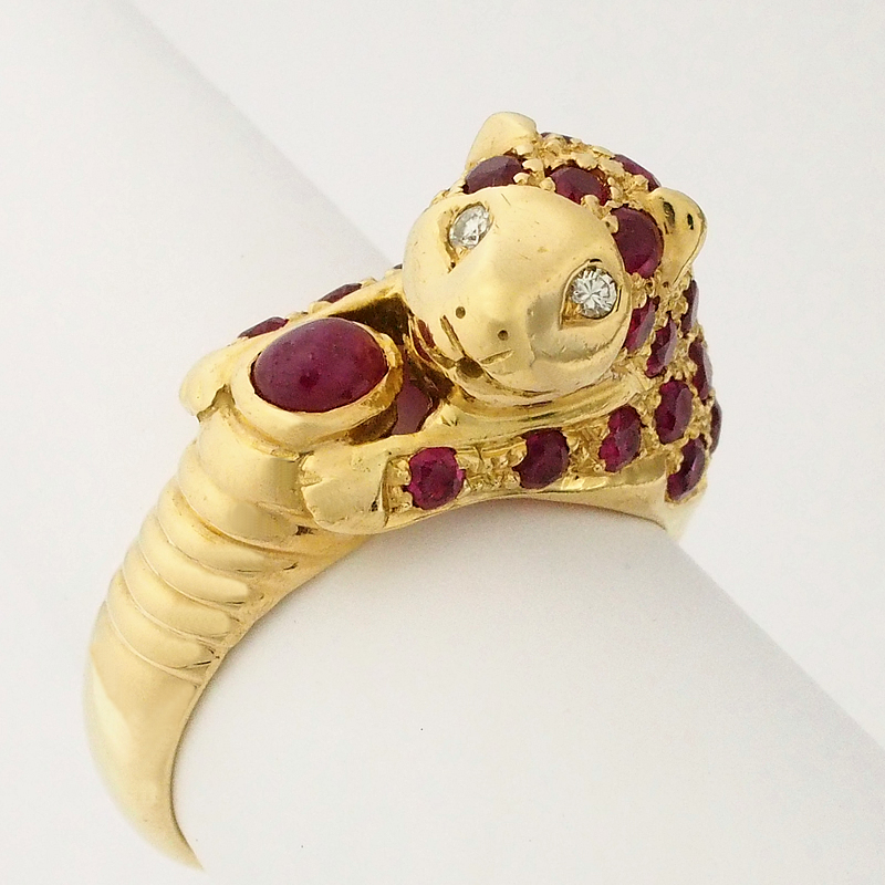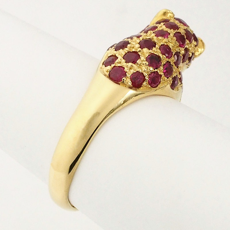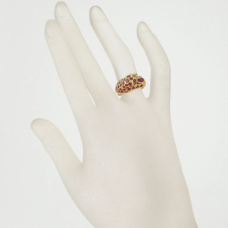 迫力のあるパンサーモチーフにルビーとダイヤモンドを散りばめたイエローゴールド製のリングです。